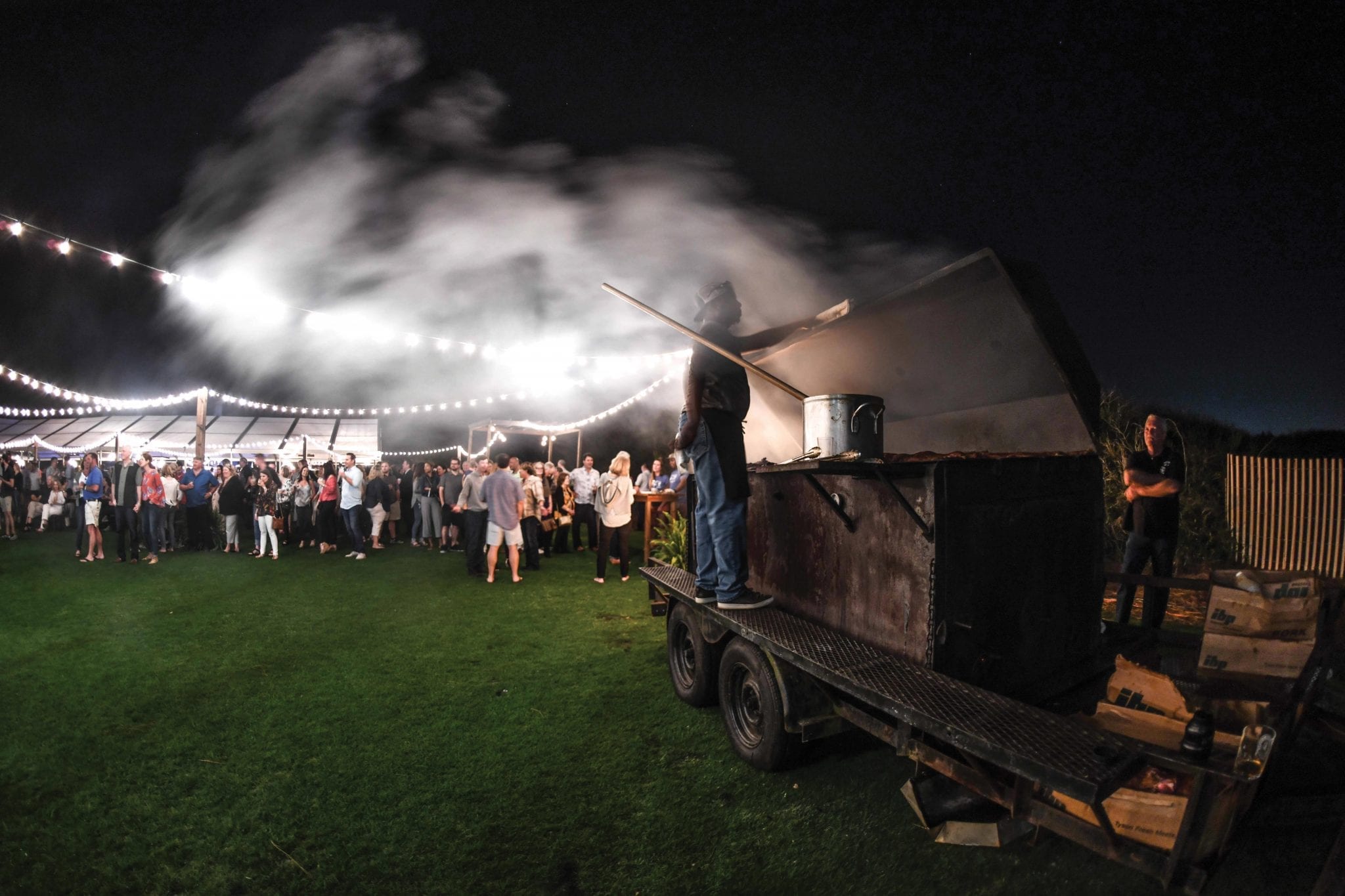 The ambience throughout was enhanced by the tireless efforts of the event team, with seamless but significant touches of elegance everywhere: outdoor living rooms where guests could gather, perched on velvet chairs and settees; the scents of beautiful flower arrangements in abundance; elegantly set tables with artfully presented dishes—from wood-fire-roasted Gulf shrimp to chicken liver mousse and tuna poke on rice crackers—and strings of white lights everywhere.