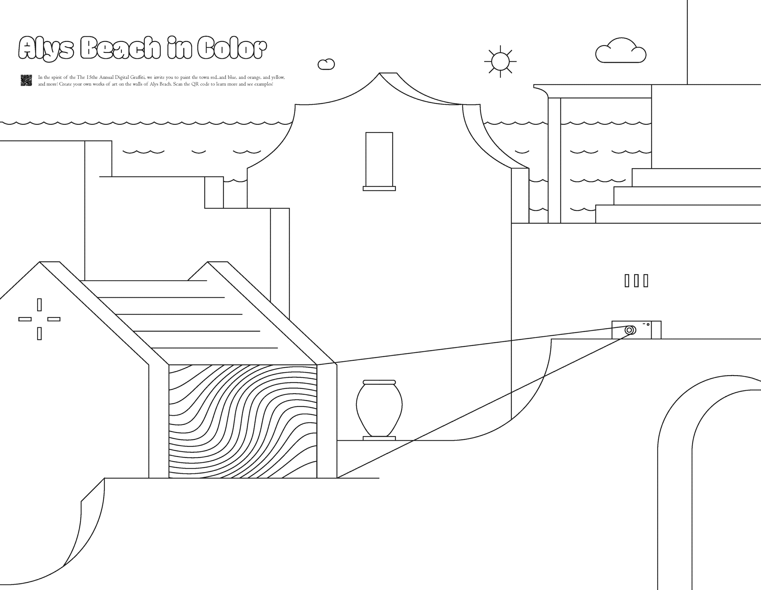 In the spirit of The 15th Annual Digital Graffitti, we invite you to paint the town red..and blue, and orange, and yellow, and more! Use the coloring page featured in the center of this issue of the Alys Gazette to create your own works of art on the walls of Alys Beach. Or download and print the coloring page to inspire your creativity and become an artist of Alys Beach.