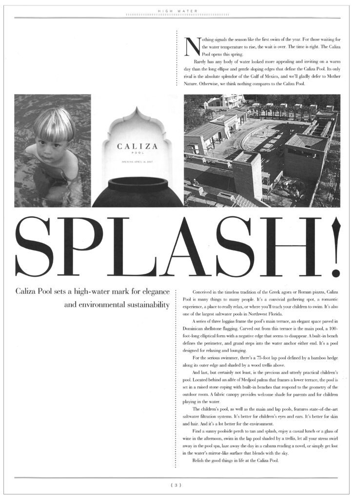 Nothing signals the season like the first swim of the year. For those waiting for the water temperature to rise, the wait is over. The time is right. The Caliza Pool opens this spring. Rarely has any body of water looked more appealing and inviting on a warm day than the long ellipse and gentle sloping edges that define the Caliza Pool. Its only rival is the absolute splendor of the Gulf of Mexico, and we ’11g ladly defer to Mother Nature. Otherwise, we think nothing compares to the Caliza Pool. Conceived in the timeless tradition of the Greek agora or Roman piazza, Caliza Pool is many things to many people. It’s a convivial gathering spot, a romantic experience, a place to really relax, or where you’ll teach your children to swim. It’s also one of the largest saltwater pools in Northwest Florida.