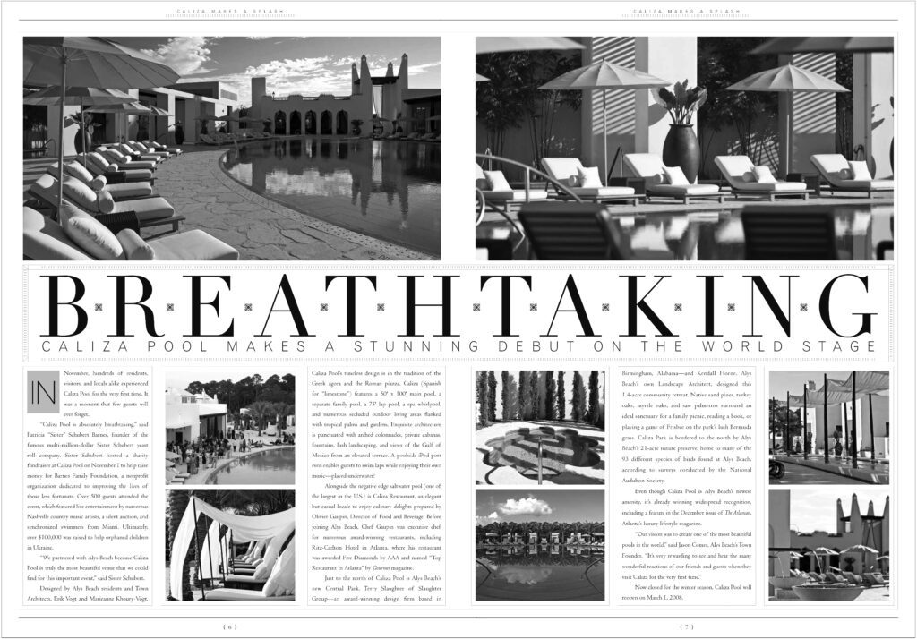 Even though Caliza Pool is Alys Beach’s newest amenity, it’s already winning widespread recognition, including a feature in the December issue of The Atlantan, Atlanta’s luxury lifestyle magazine. “Our vision was to create one of the most beautiful pools in the world;’ said Jason Comer, Alys Beach’s Town founder. “It’s very rewarding to see and hear the many wonderful reactions of our friends and guests when they visit Caliza for the very first time.
