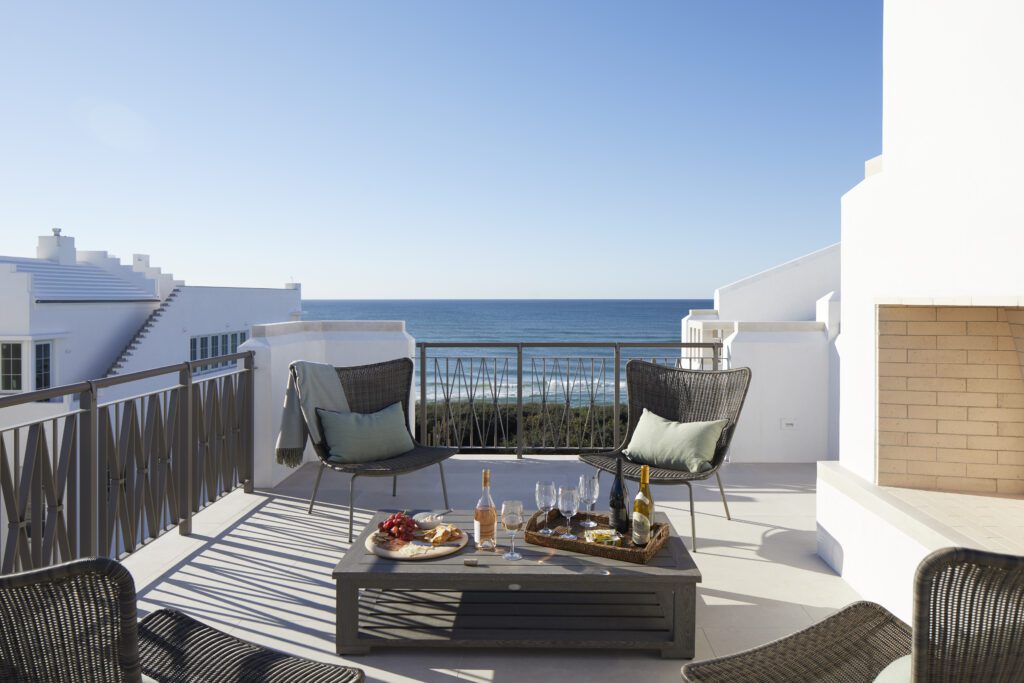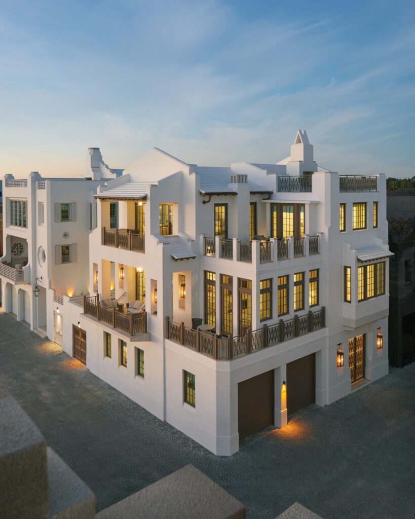 The figurative crowning jewel of the home is the spacious roof terrace, accessible by stairs leading up from the third floor. With a corner lot, the Perrys have expansive views to the Gulf on three sides of the house, but the broadest view is here, in the southeast corner of the home, set back slightly to make the most of the view looking toward the town as well as the water. “When we have friends over, we’ll go up there, have a glass of wine, and enjoy a beautiful evening sunset,” Heidi says. “What’s fun is that as more and more of the homes are completed, we can see our neighbors also up on their roof terraces, so we like being able to wave and talk to them.”