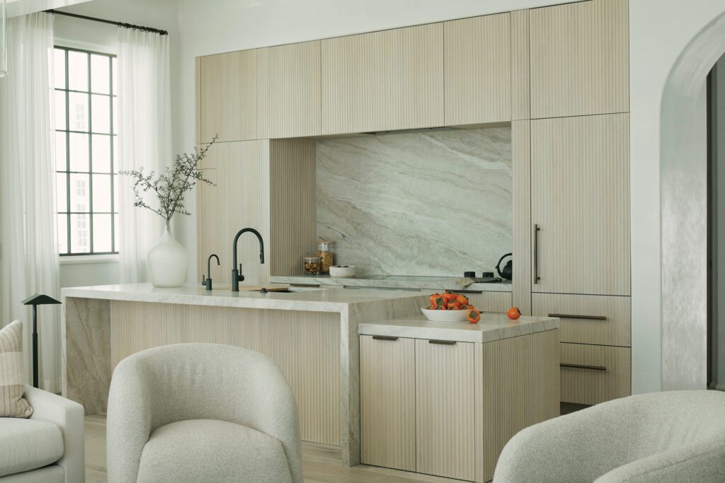 “Because the front kitchen is open to the living room, we wanted to make that moment a vignette,” Khoury-Vogt says, “with all the appliances they don’t necessarily need on a daily basis kept out of sight.” The pantry is accessible through a door built to match the scalloped cabinet fronts. “It’s designed as part of the cabinetry, so it looks like it could just be another cabinet but actually leads to a whole room.”