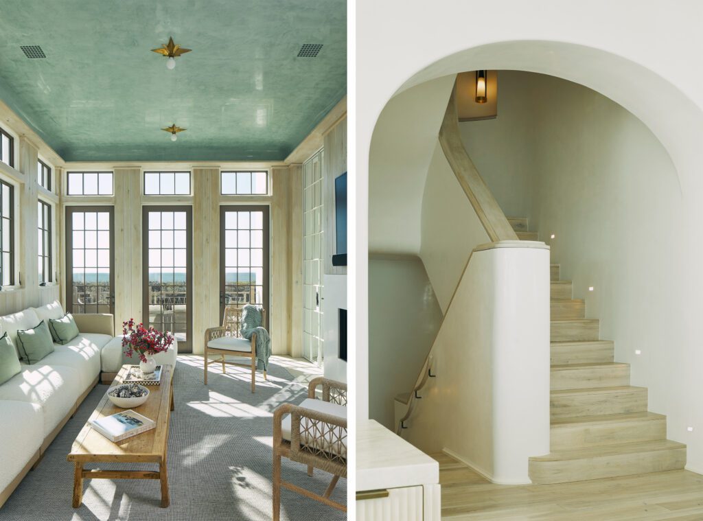 In other spaces, soft neutrals serve as the backdrop for a stunning accent, usually a hue of blue or blue-green. Such is the case in the solarium, a light-filled seating area that opens off the living area. This room is a favorite for many reasons, including a two-sided fireplace shared with the living area that connects the two spaces. But what truly stands out is the ceiling, rendered in a reflective, polished blue-green plaster that evokes the sky or the Gulf itself.