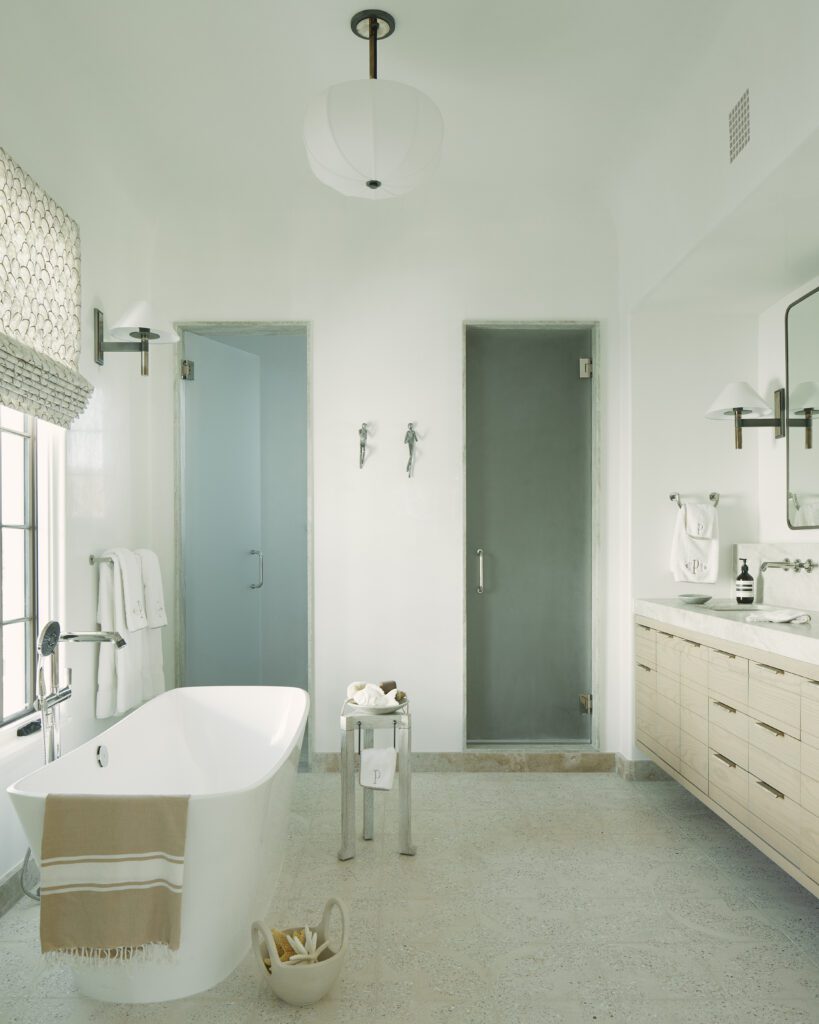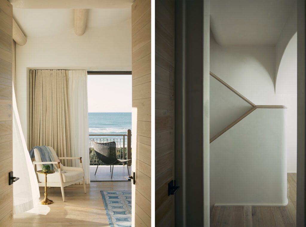 Blue also adds another dimension in the primary bedroom, where Heidi designed a blue scalloped bed that sets the tone for a room with a playful metaphor of drapery in the vaulted ceiling, where the plaster ceiling is ‘draped’ over the descending round beams. This also evokes waves, reflecting the ocean to the south, a view that becomes another focal point of the room. “The views out the bedroom are wonderful,” Heidi says. “We see a lot of sea life, especially dolphins, in the morning. That is special for us.”
