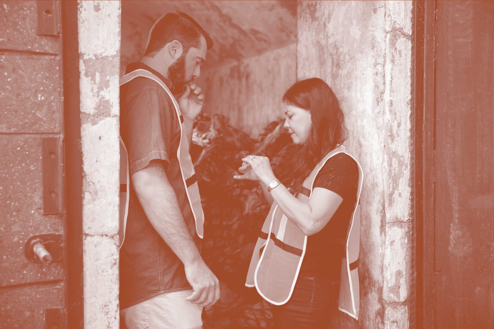 Once the agave’s piña—or pineapple—is removed, the agave leaves are removed, and the piña is cut into four parts to fit into the masonry ovens. At Leyenda de México, the adobe ovens are made of the earth from where the blue agave is planted. These ovens will cook the piña with a mixture of heat and steam for 24 hours, with an additional day of rest. Austin and Melly climbed to the top of the pile of the still-warm agave and gave it a taste. Austin explains, “It’s the texture of steamed artichoke—fibrous—with the taste of sweet tea. The aroma reminded me of times when my mom would cook sweet tea on the stove at home. It would fill the whole house with this sweet smell.”