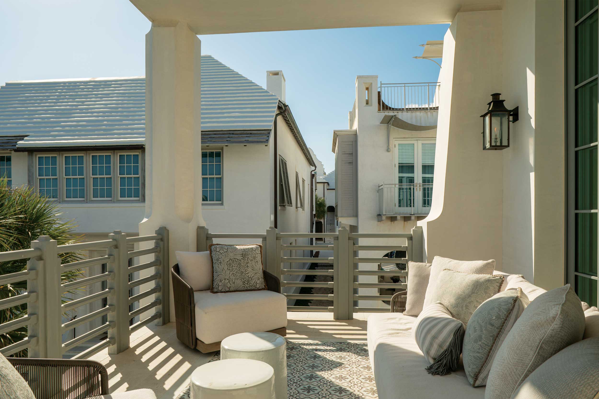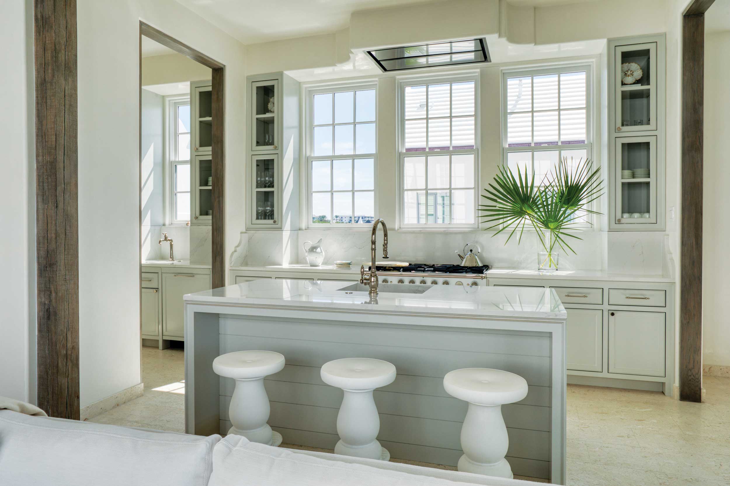 Town architects Marieanne Khoury-Vogt and Erik Vogt, who designed the Linvilles’ home, employed architectural details throughout to capture the spirit of living seaside. “We deployed a scallop motif that is repeated in many forms—masonry, wood, and arches,” says Khoury-Vogt. It’s seen in details such as a custom-made staircase handrail that is draped along the wall, and in scalloped niches here and there to tuck an intimate dining table or cozy seating perfect for reading a book or enjoying a cup of coffee.