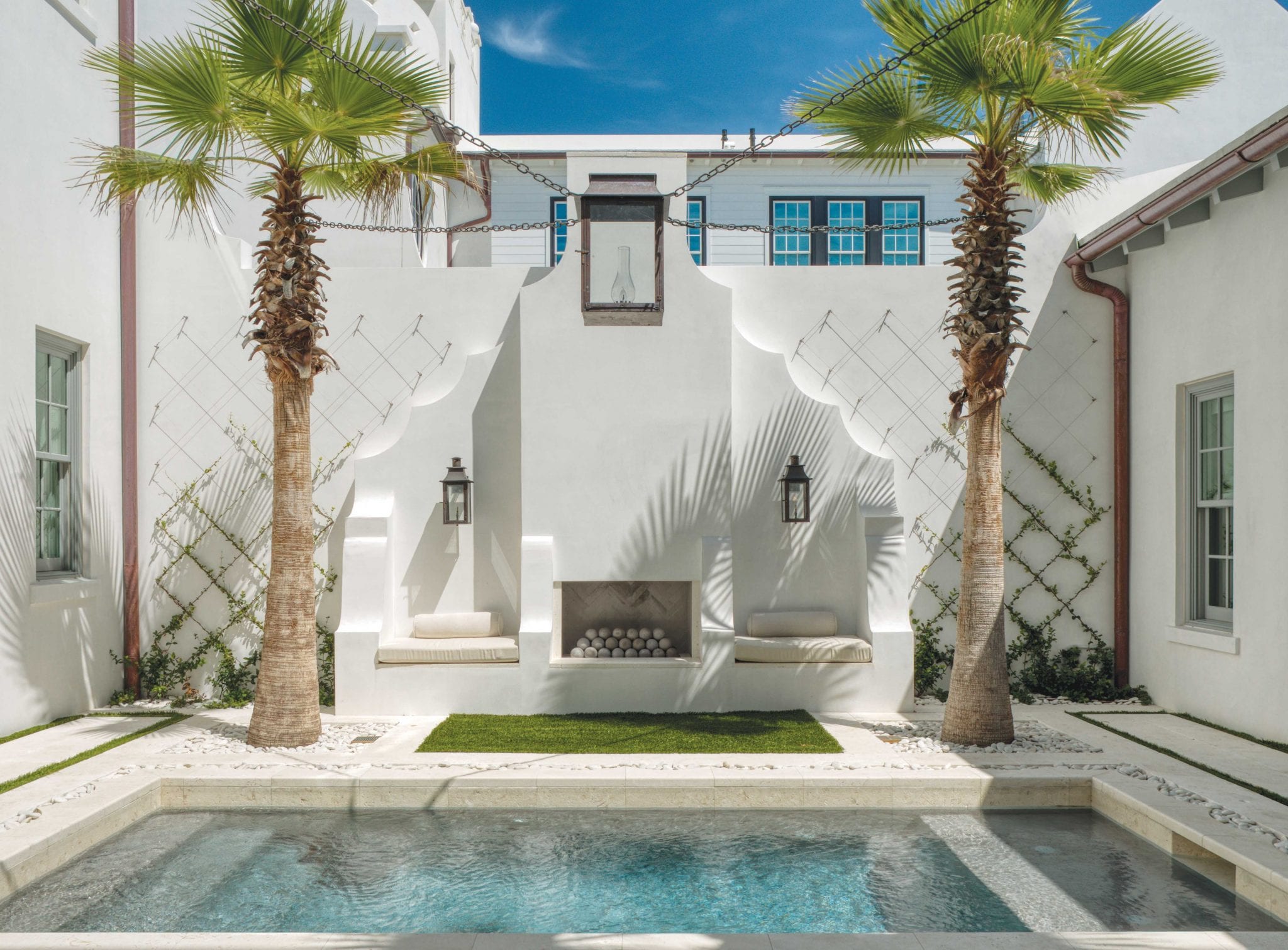 The home’s centerpiece, literally and figuratively, is the first-floor courtyard and pool. An outdoor fireplace flanked with benches sits inside a scalloped niche. The blue of the water and two miniature plush lawns add vibrant color in happy contrast to the white walls, and a giant lantern is suspended over the full courtyard. “The lantern is connected to the four palms that anchor the courtyard and provide some shade,” Khoury-Vogt says. “We thought at night it would be beautiful to have a light centered over the pool.”