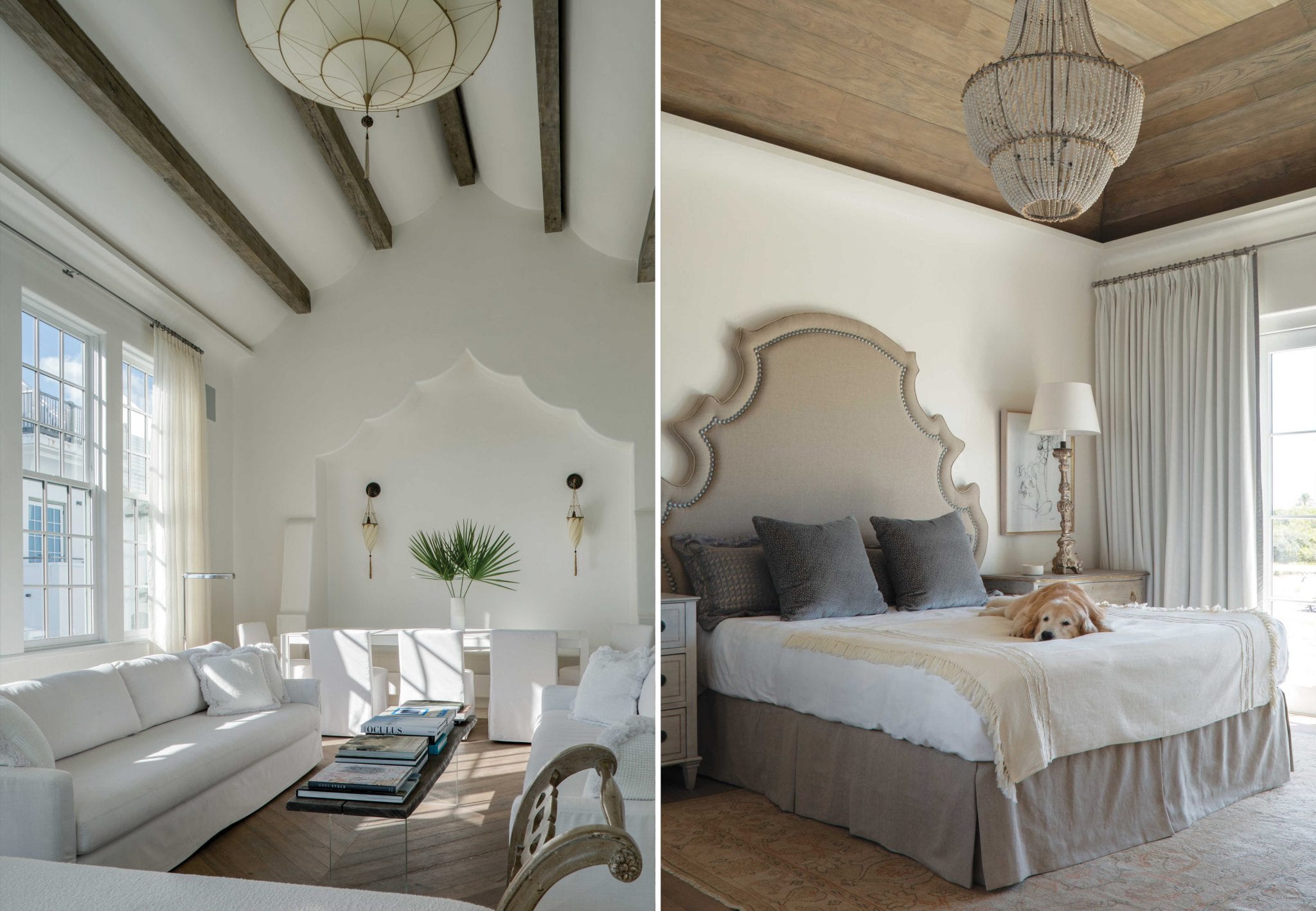 While elegant nuance defines many of the rooms, the architects brought more drama into the second-floor living room, with glass pocketing doors connecting the great room to the loggia overlooking Sea Garden Walk, the main pedestrian pathway through Alys. The great room also has a unique sense of space defined by a draped ceiling with wood beams, centered by a suspended Fortuny lamp from Venice. “The ceiling gives the great room a sense of scale and grandeur we felt was important,” says Khoury-Vogt. At the same time, the floor design—stone surrounding a herringbone pattern of wood that is inlaid flush, like a rug—creates intimacy.