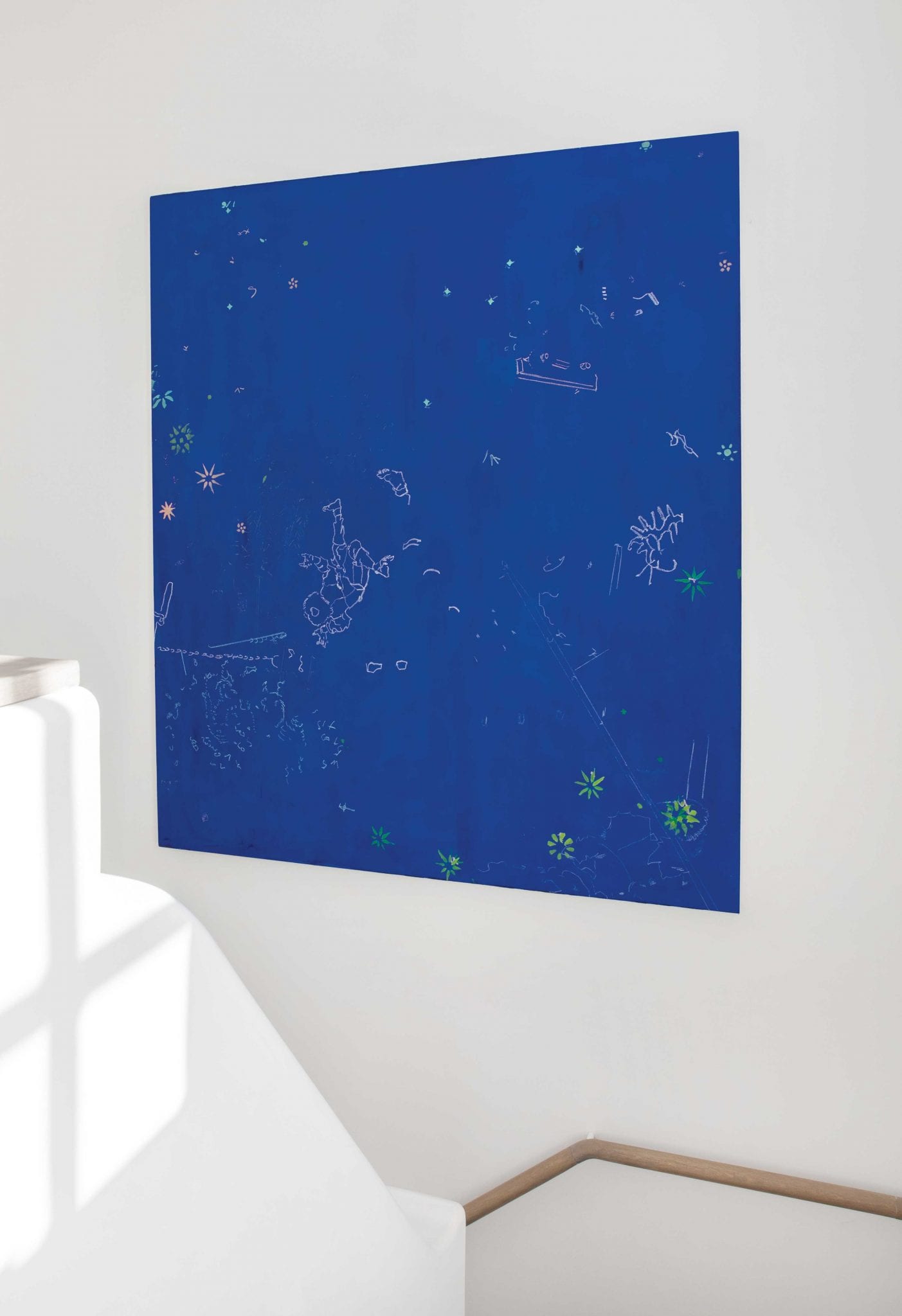Gael Stack’s paintings are celestial, thought provoking and serene all at the same time,” Karen says. “The painting is a lovely contrast to the very white surroundings—intensely colorful but not loud.”