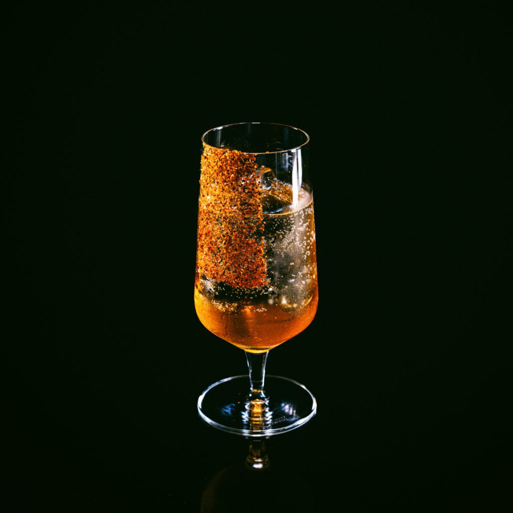 Dash of Angostura Bitters, stir, strain over medium cubes with large tajin rim, top with Topo Chico in beer glass.