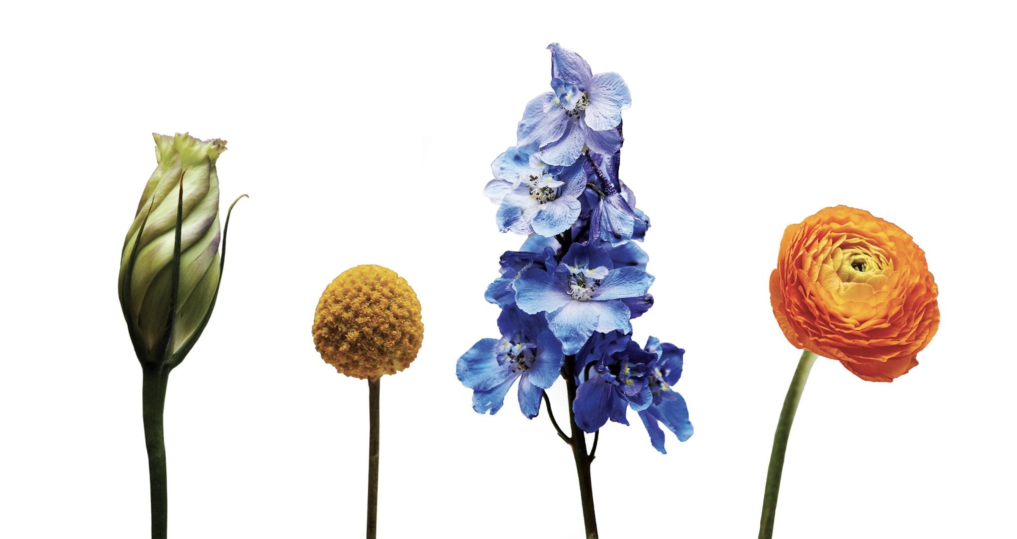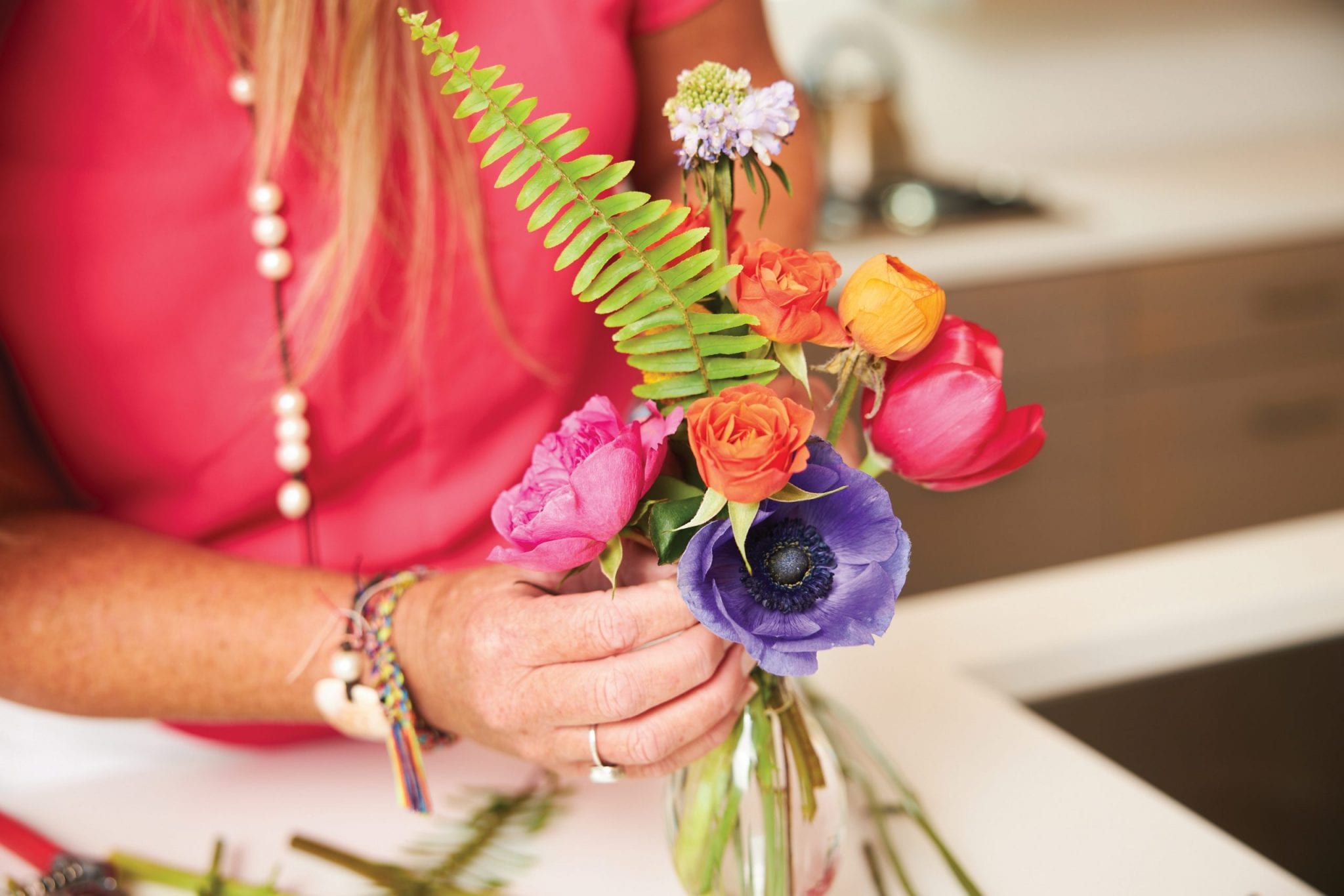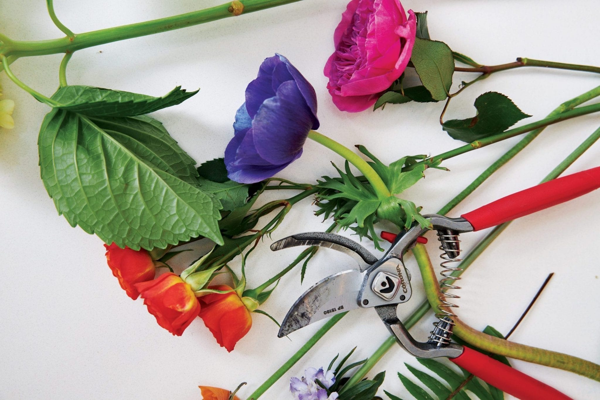 Flowers to gather: Larkspur, tulips, scabiosa, ranunculus, crispedia, spray roses, and sword fern (If these are unavailable, Fisher says to find any flowers that are vibrant and offer unique textures.)