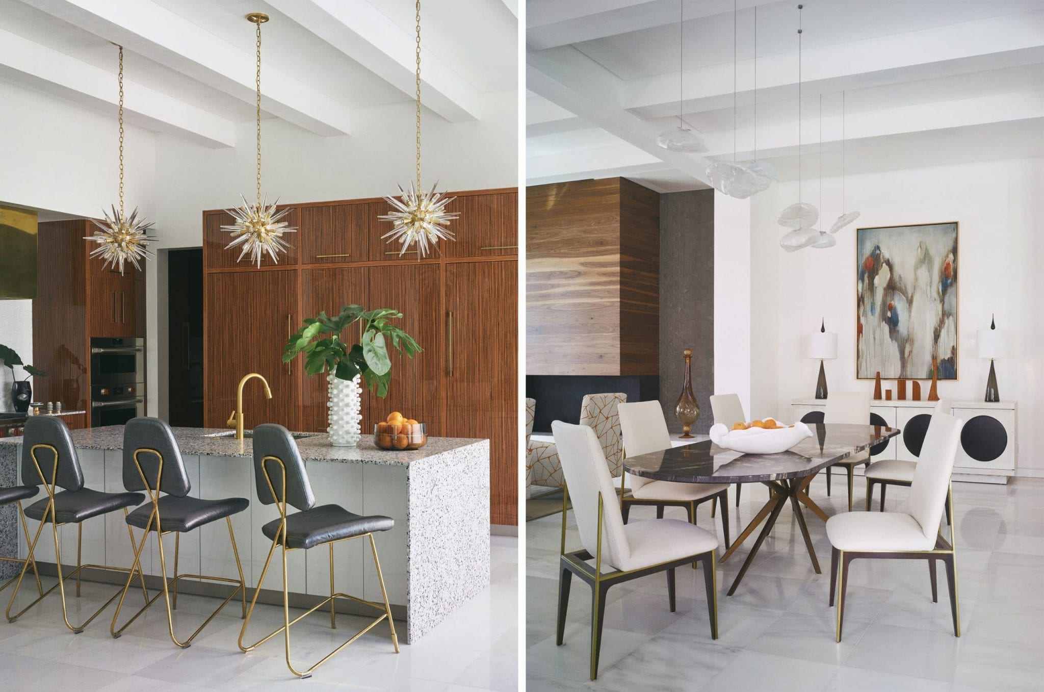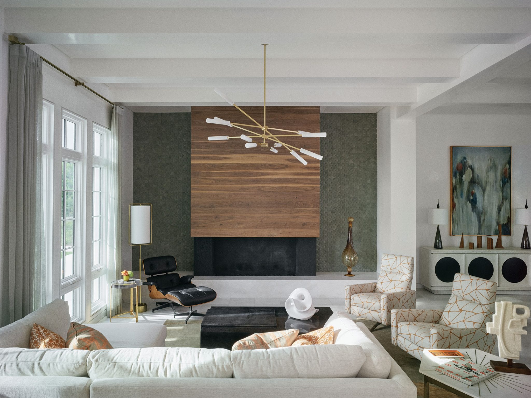 “We could mix in something old or something more soft and comfortable right alongside the mid-century pieces. Midcentury pieces mix in no matter what—that’s not a ‘trend’ to me. It’s just a matter of mixing it up properly and getting that marriage just right.” She adds that while it’s not evident to the naked eye, she and the Bonds freely commingled high-end furnishings and accents with less expensive pieces. “It just all came together with sophistication.