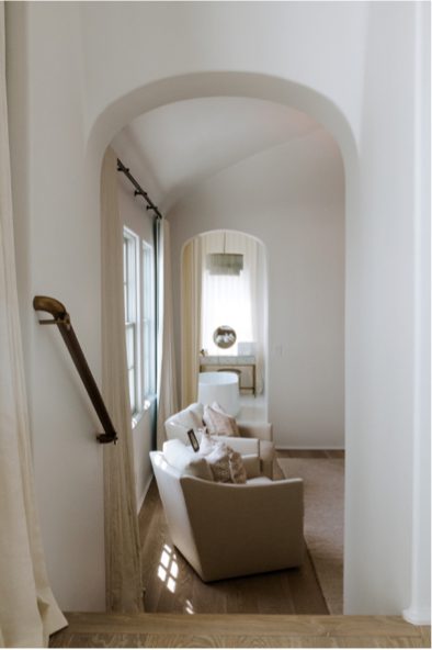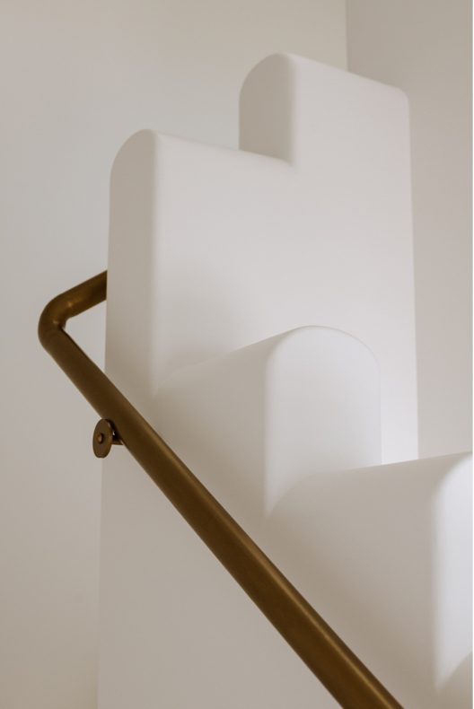 An early choice they all seized on was the height of the ceilings, which soar higher than 15 feet at points to create a commanding sense of space and reflect a scale more common in the Middle East, where high ceilings help keep living areas cool. There was also a spillover effect, with furnishings selected or placed to accommodate the scale, and a unique winding staircase that Marieanne describes as “modest but sculptural,” designed for a tall climb that isn’t overwhelming. “We knew there would be many stairs to ascend from the first floor to the second, so there are multiple landings to ease the climb.”