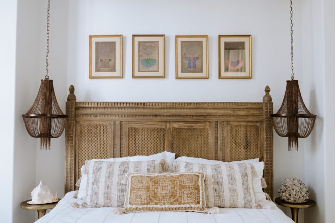 These include furniture pieces in the living room from a Lebanon-based company called Bokja whose work Leslie admires, including a favorite bench and two chairs featuring coral and seahorses that feel like perfect fits for Alys. “They’re artwork,” she says. “The textile work is amazing, and the embroidery is done in a Palestine refugee camp outside of Beirut. These are some of the unique pieces I love that we have in our house.”