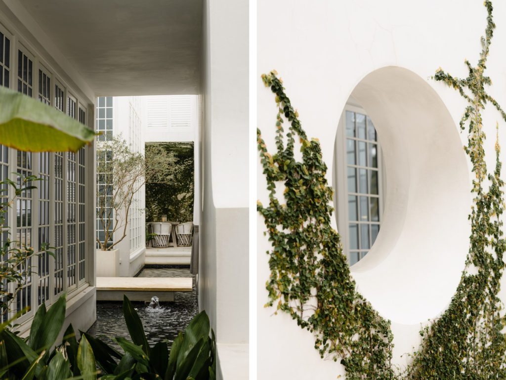 Iain says they were immediately drawn in by the welcoming arched courtyard entry flanked by lattice doors, as well as the water feature they like to call the “moat,” which creates a subtle separation between the park that sits in front and the house proper. A bridge that appears to float over the water delivers visitors to the front door. “The moat and bridge bring a lot of mystery to the space,” Iain says.