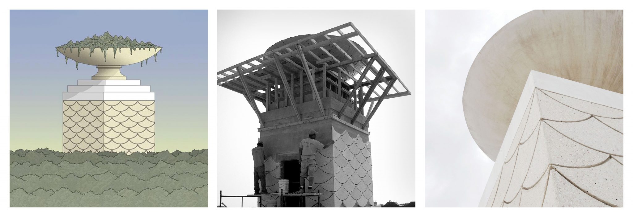Sketch and construction of the Gulf Green bathhouses with their exaggerated urns, scale pattern detailing, and perfect harmony. From conception to completion, the functional forms of Gulf Green’s bathhouses with their towering scale, symmetry, and whimsical detailing have conspired to create an iconic moment that defines this precious gathering space in Alys Beach. Architectural design by Khoury Vogt Architects, constructed by Alys Beach Construction.