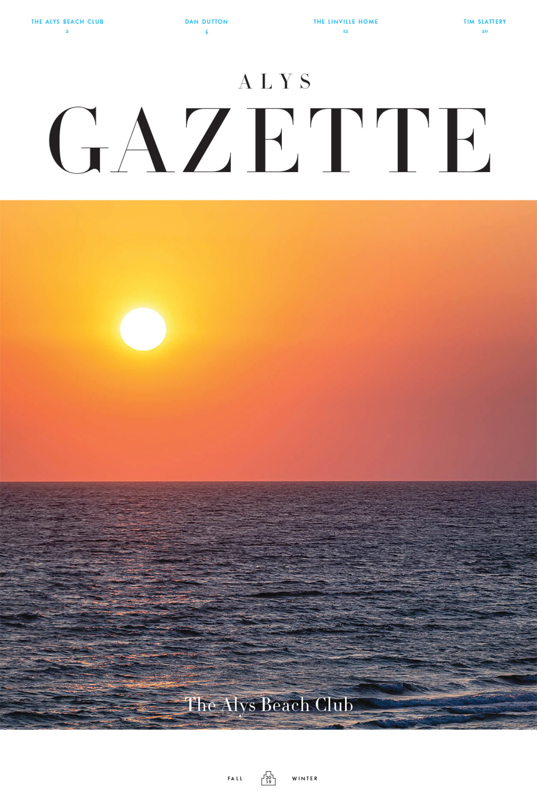 Enjoy cool weather, warm beverages, and a fresh, new Gazette to cozy up with this fall and winter. Whether you’re hearing the sounds of the Gulf out your window or dreaming of it from afar, we hope this issue brings you the warmth that Alys Beach offers year-round.