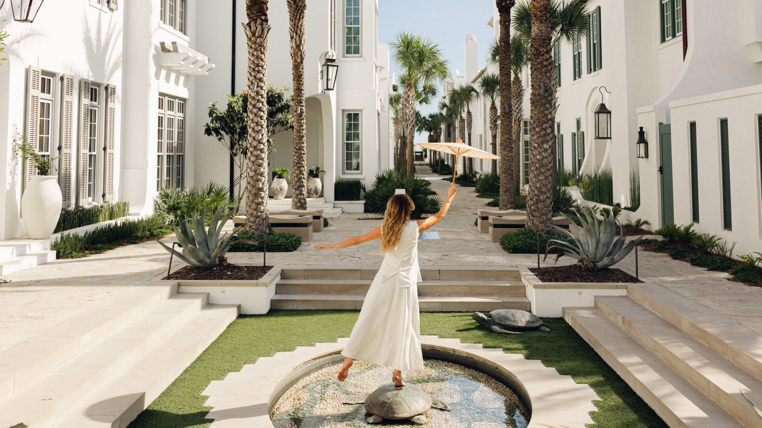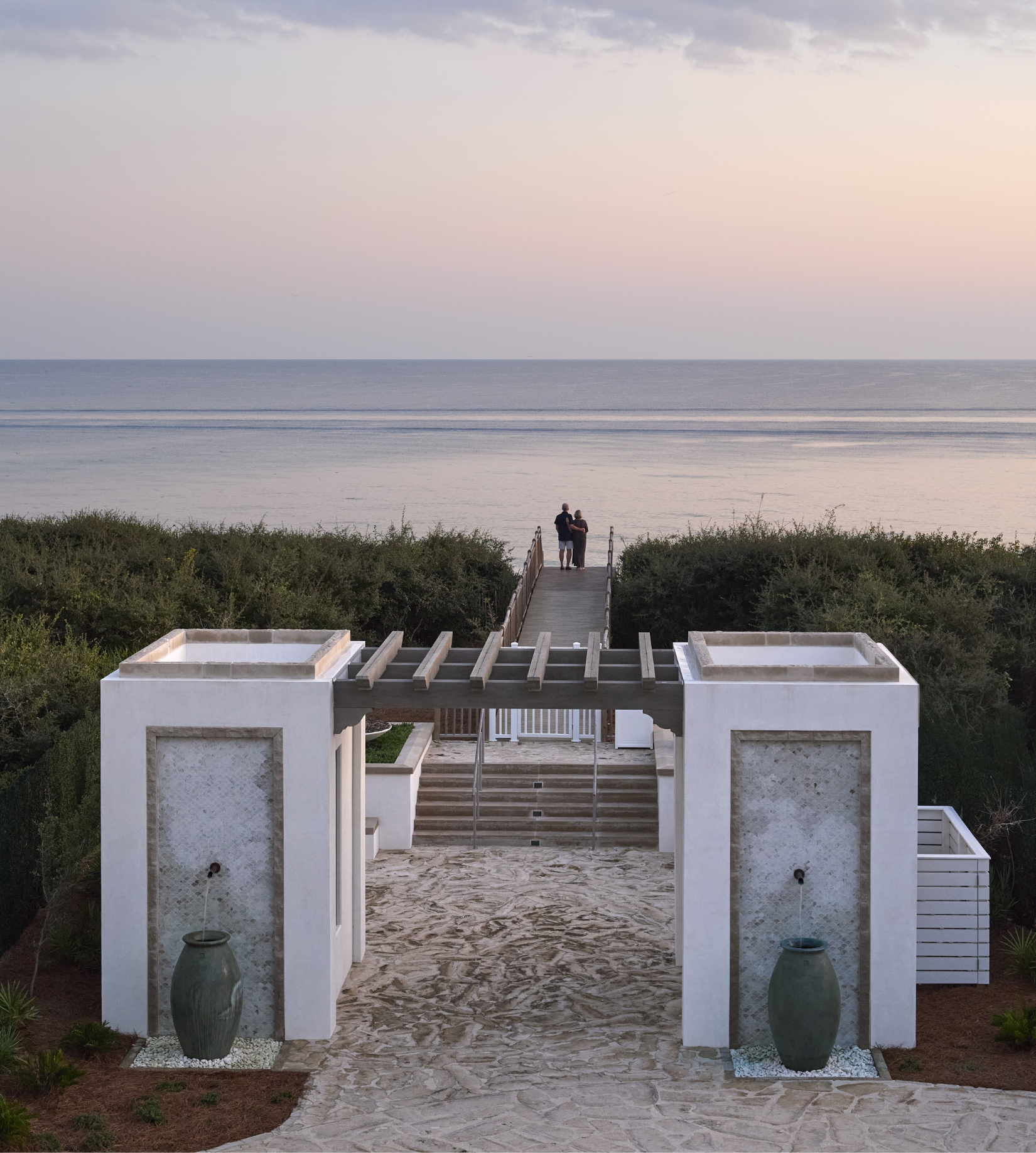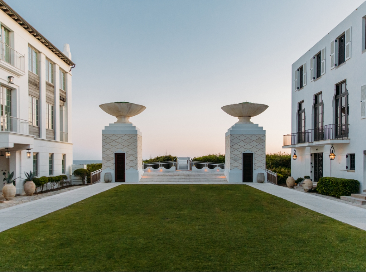 The Gulf Green, Alys Beach’s original green space, offers private beach access and features a tranquil water structure, inviting visitors to the peaceful, white sands below. Majestic urns stand tall for all to admire, and a high-point wooden deck provides perfectly breezy and panoramic views of the Gulf horizon.