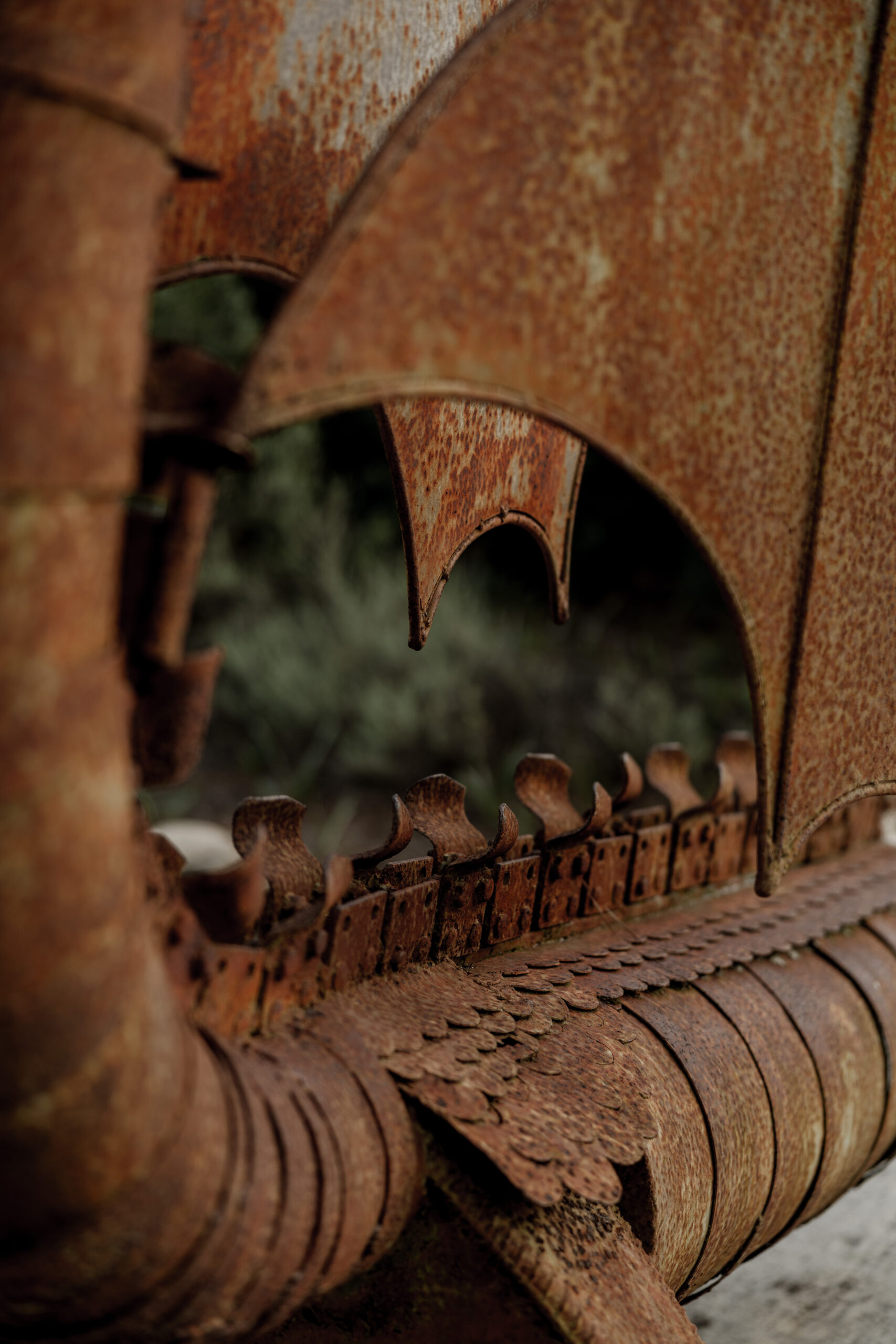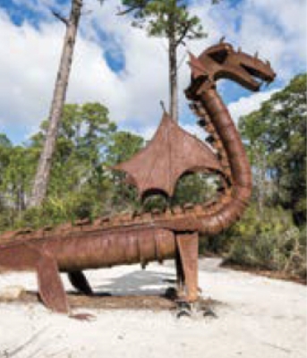 Fabricated of forged steel with repurposed metals, this oxidized dragon emerges from the pines and palmettos of the Nature Trail.