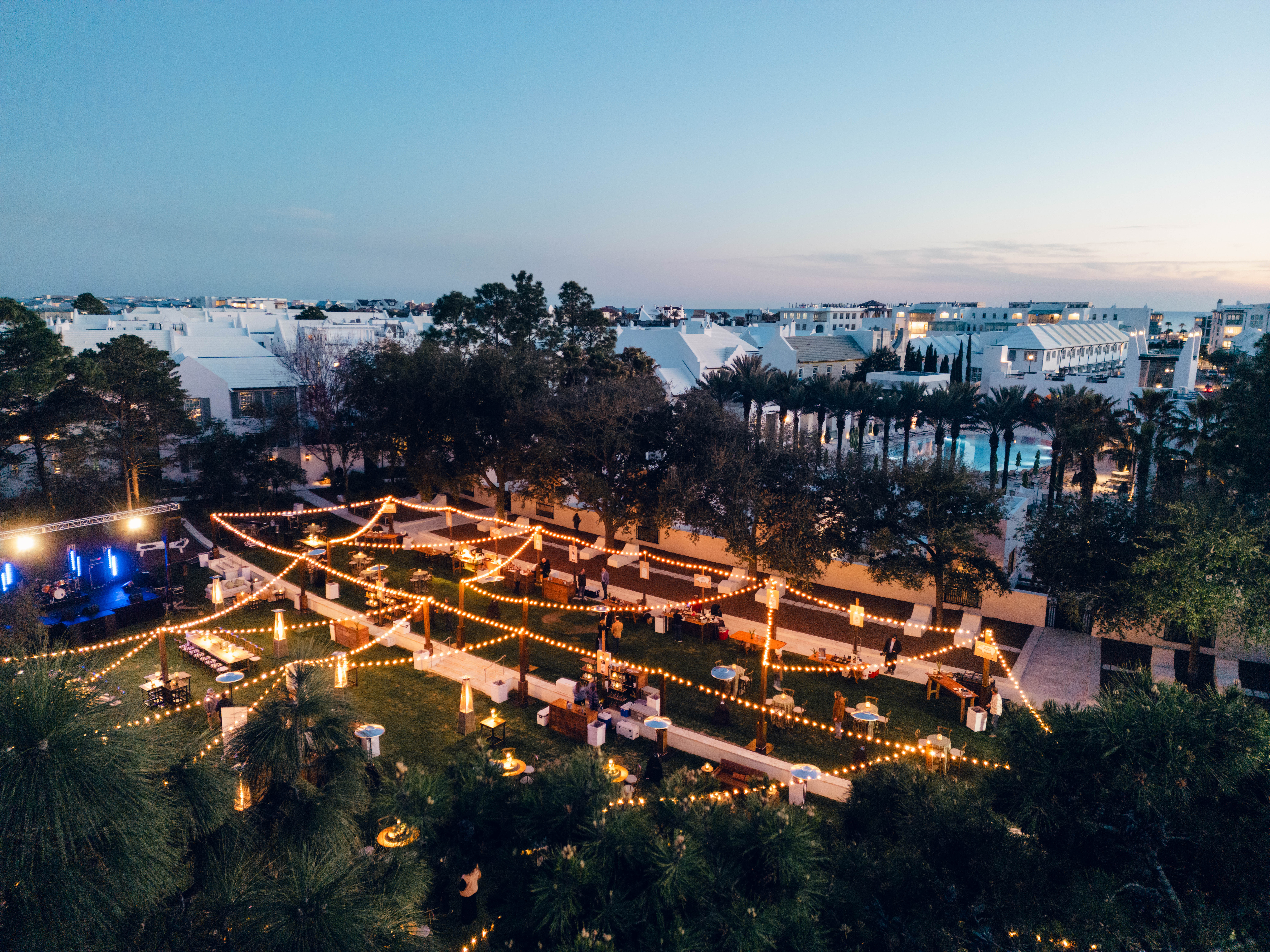 The Alys Beach Amphitheatre is a vibrant hub for events, performances, relaxation, and play, featuring a perfectly sculpted sloped lawn leading to the majestic Gulf waters and a whimsical fountain — perfect for children to enjoy and explore.