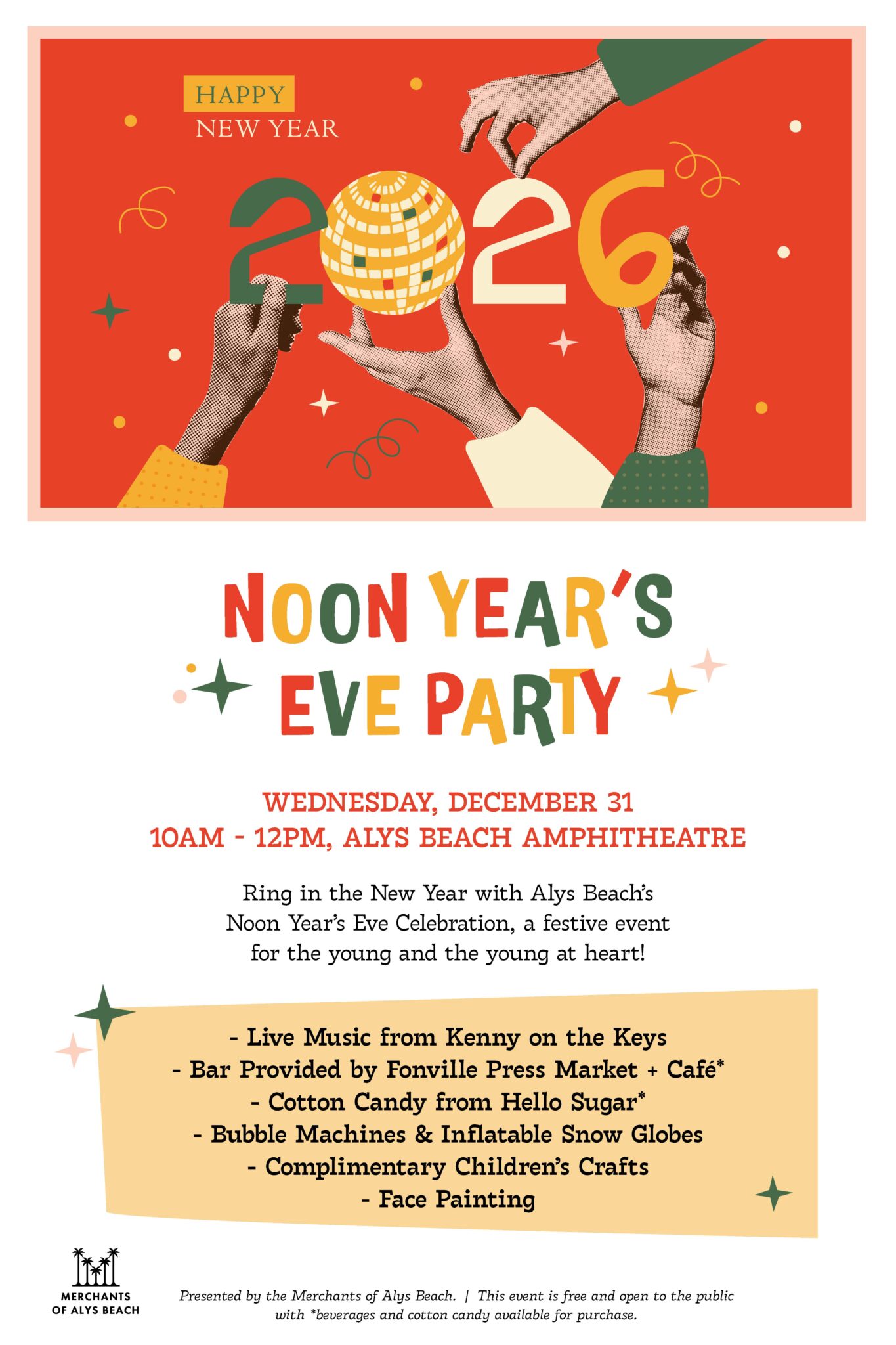 Ring in the New Year with Alys Beach’s Noon Year’s Eve Celebration, a festive event for the young and the young at heart! Enjoy live music, bubble machines, an inflatable snow globe, crafts, face painting, and a bar provided by Fonville Press Market + Café.