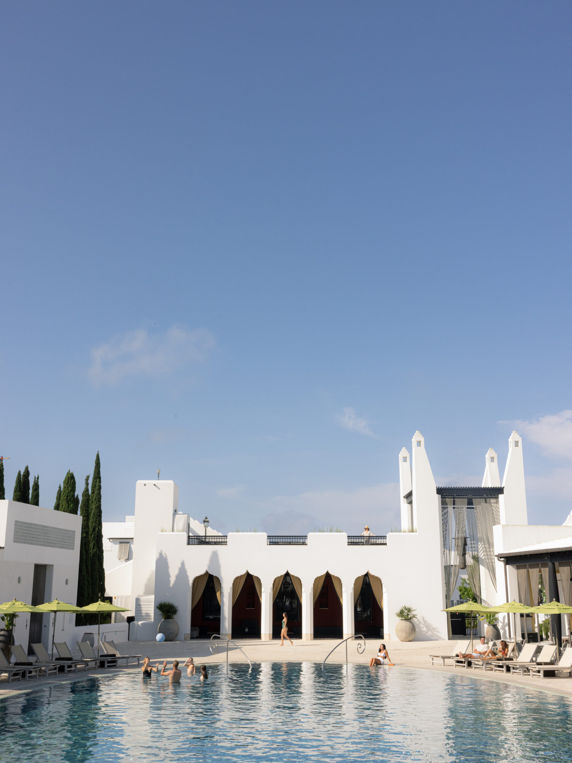 Caliza Pool & Restaurant at Alys Beach features multiple pools, an open-air restaurant, and serene spaces for relaxation. Its award-winning design blends exotic Moroccan and Mediterranean elements with those of the classical traditions found in Greek and Roman architecture, offering a tranquil oasis with casual dining and stunning views.