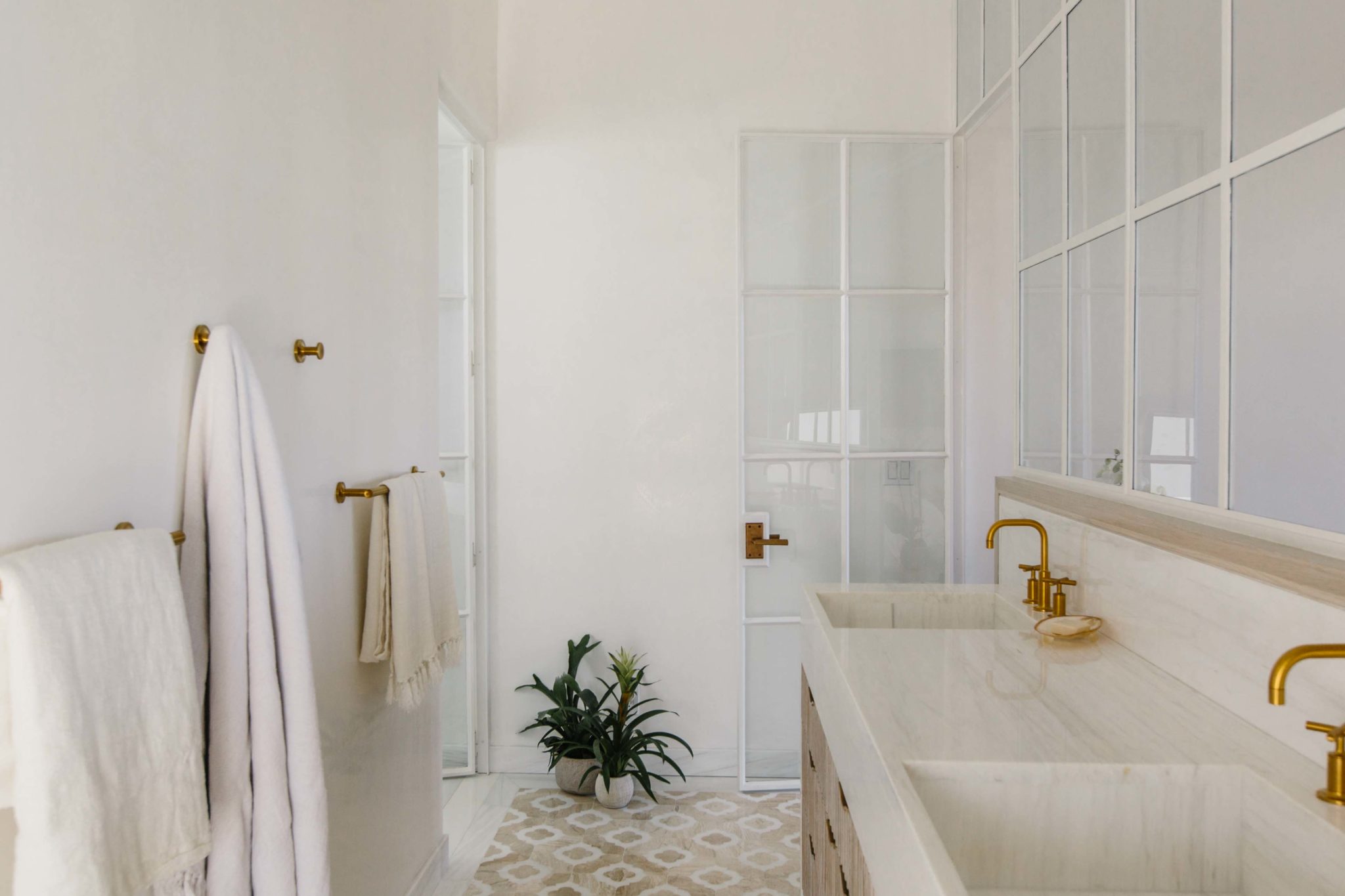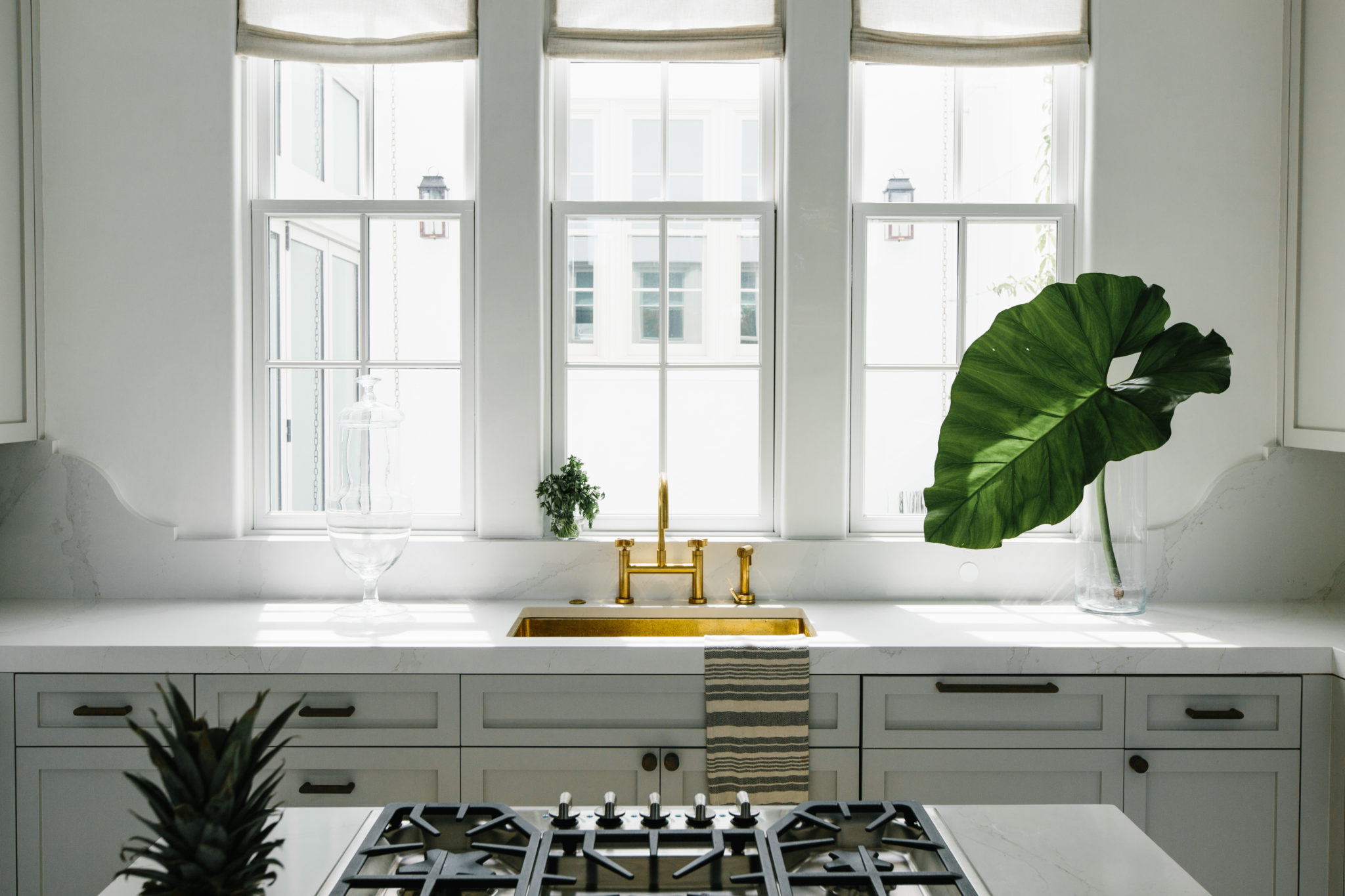 The architects gave the owners the open kitchen they wanted, but tucked it into an alcove besides the dining area. Inset cabinets painted pale gray provide a subtle contrast against the white walls, and thick marble countertops transition into a backsplash with graceful ogee curves. Smith and Massey applied a brass toe kick to the base cabinets that ties to the unlacquered brass faucet centered under the trio of tall windows overlooking the pool in the courtyard. “We come up with a special detail, then stop,” Smith says. “Sometimes less is more.”