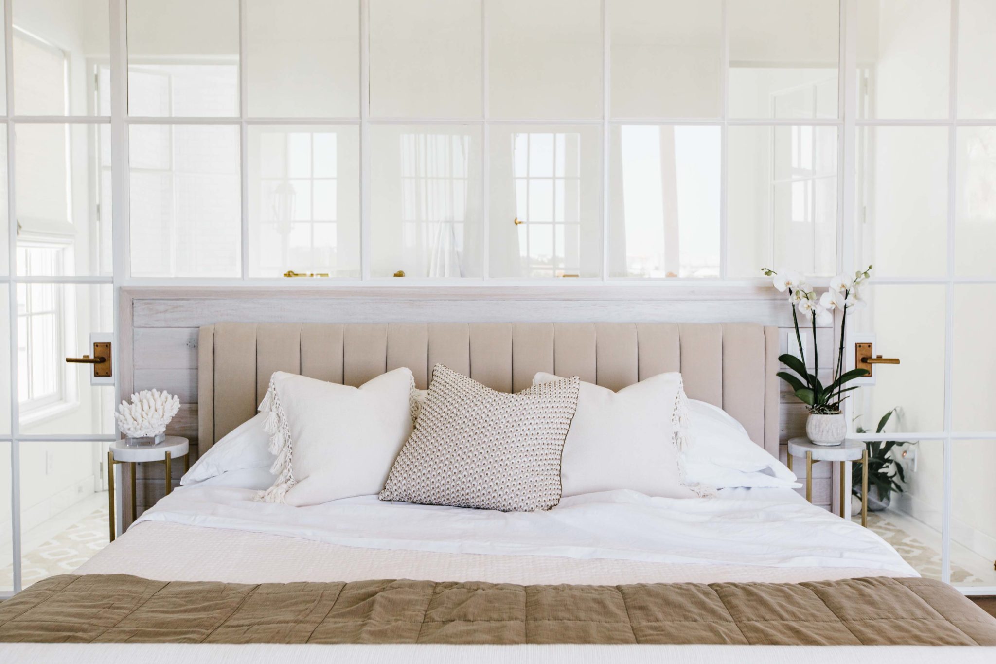A romantic chandelier draped in soft white wood beads hangs over the khaki-colored velvet bed dressed in linen. “The owner loved the headboard’s tufting detail and was excited about the beaded chandelier,” says Smith. “The room is a study in respecting her love of pretty things, but reigning it in with a natural fibers and sloppier presentations.”