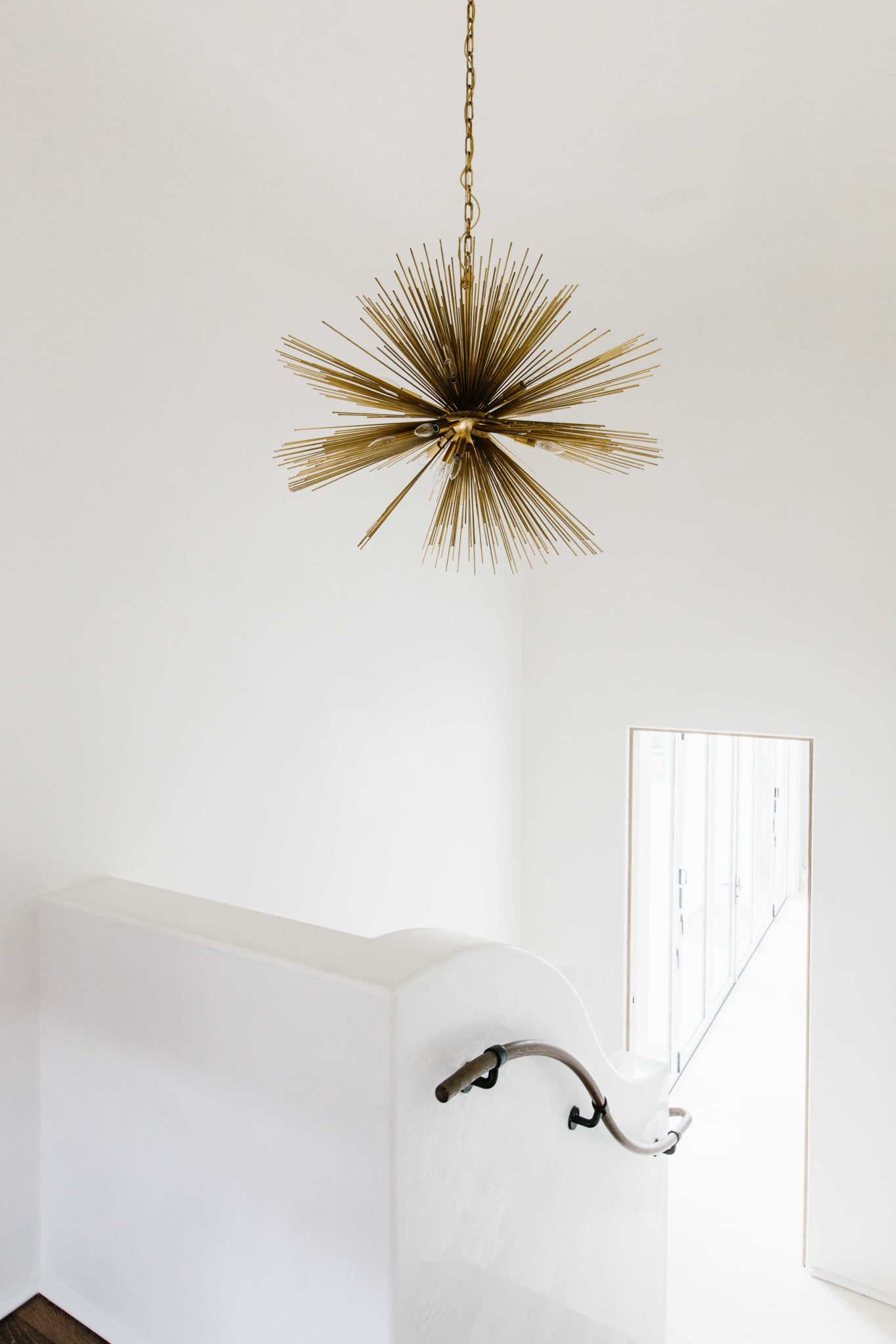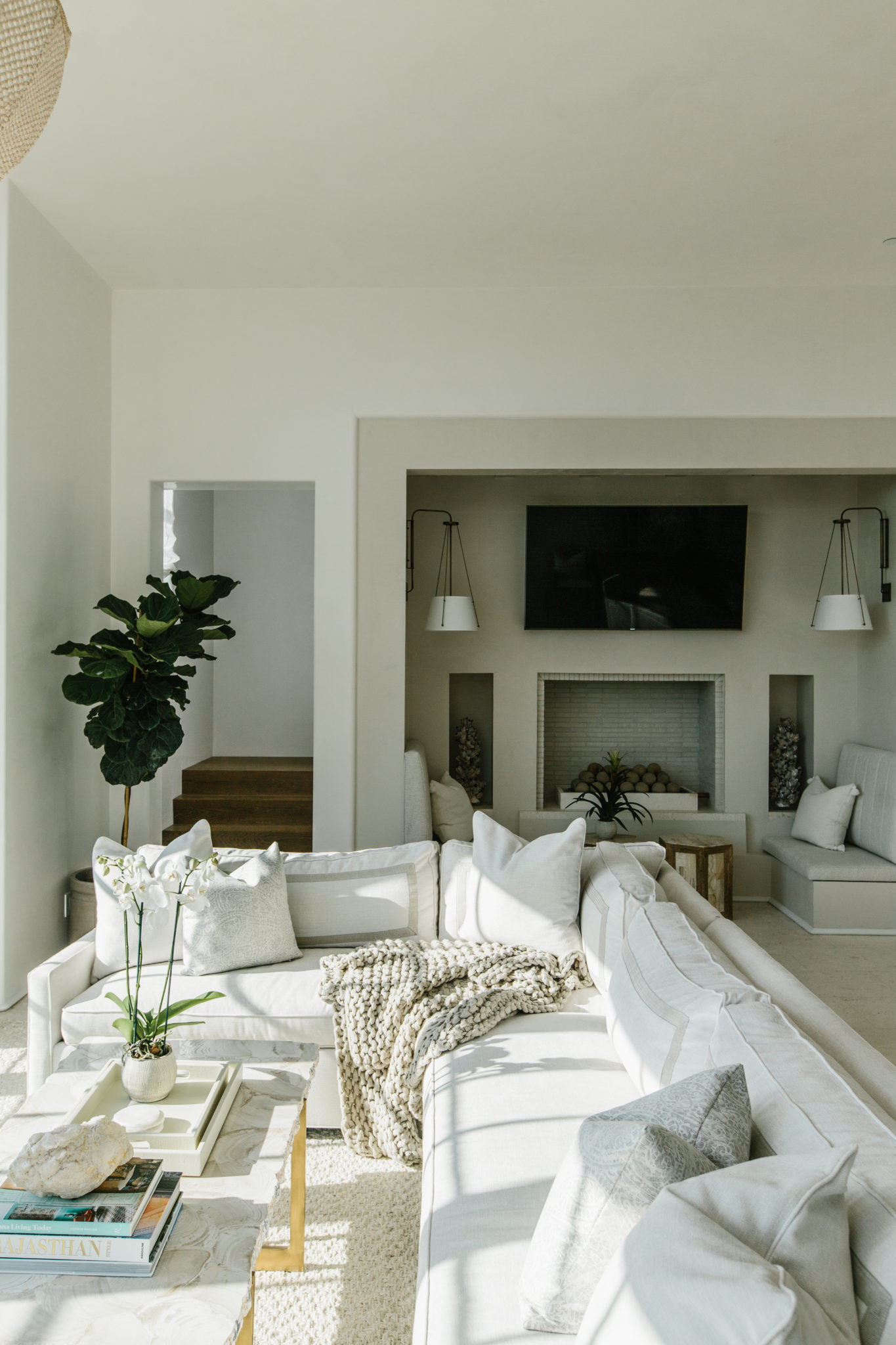 Smith Carries the sentiment to the dining area with a statement chandelier made from a hollowed, whitewashed wood. “It feels like a piece of sea life,” the designer says, noting that the light drove the selection of the minimalist, cerused oak pedestal table and rattan-wrapped, cane-backed chairs brass-capped feet beneath it. “We went around with different pairings a few times to find just the right combination of simple and interesting for the client,” Smith says.