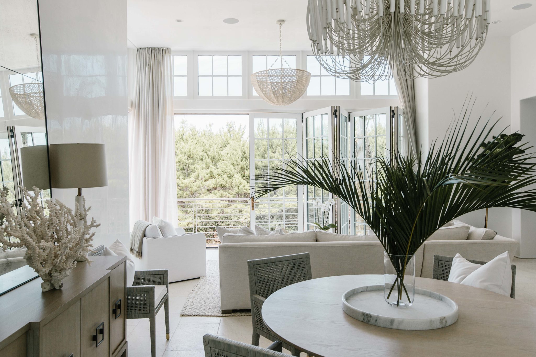 The stair opens into the sun-filled, high-ceilinged great room where accordion doors open the entire southwest corner, essentially transforming the seating area into a covered balcony. “It really brings the outdoors in,” Khoury-Vogt says of the design, which offers views up and down the Emerald Coast.