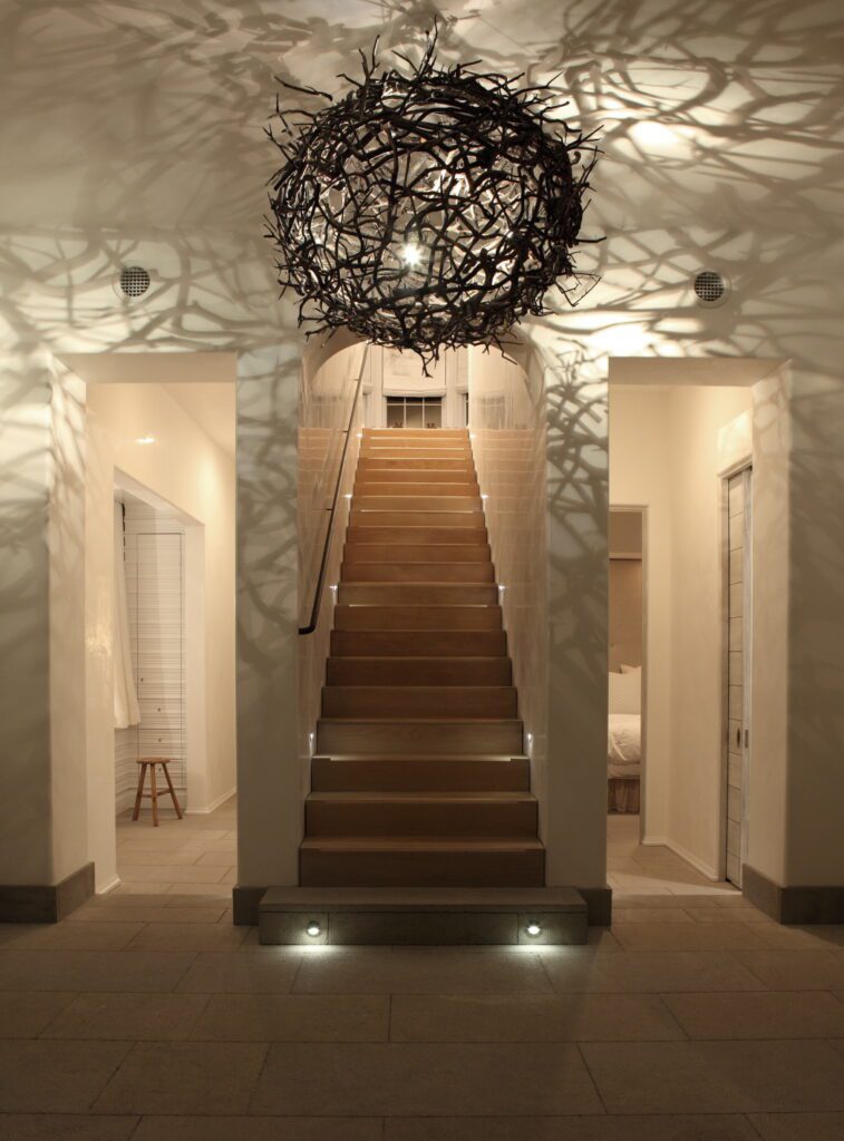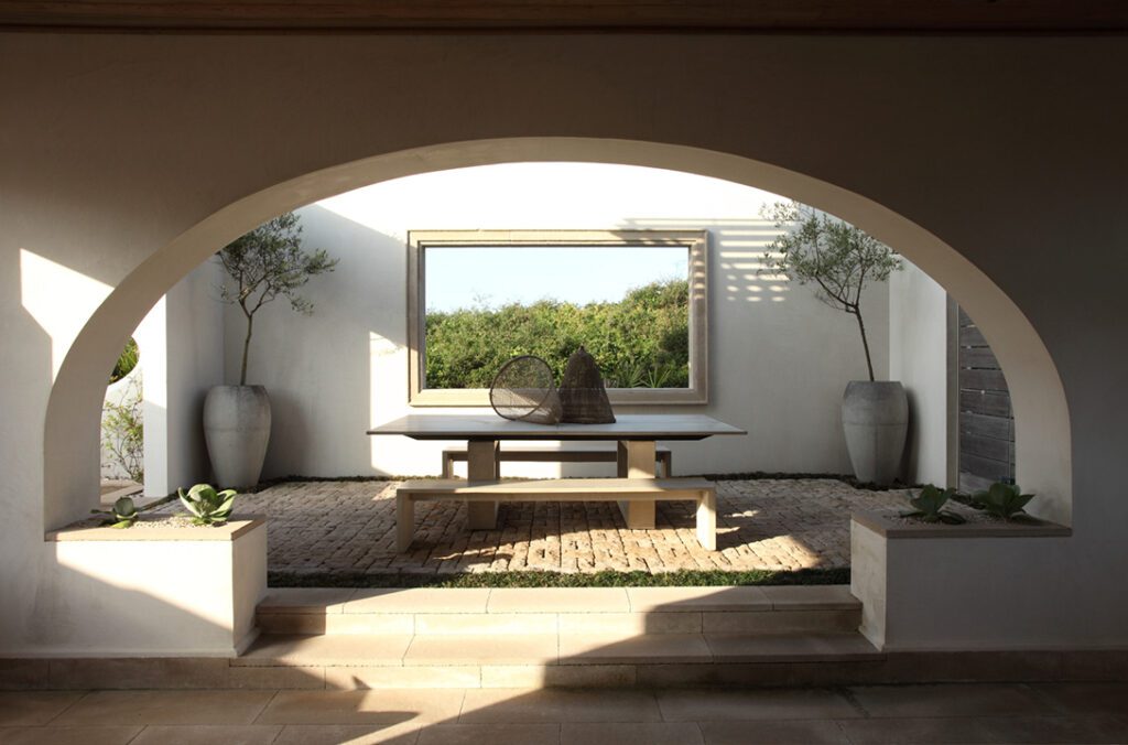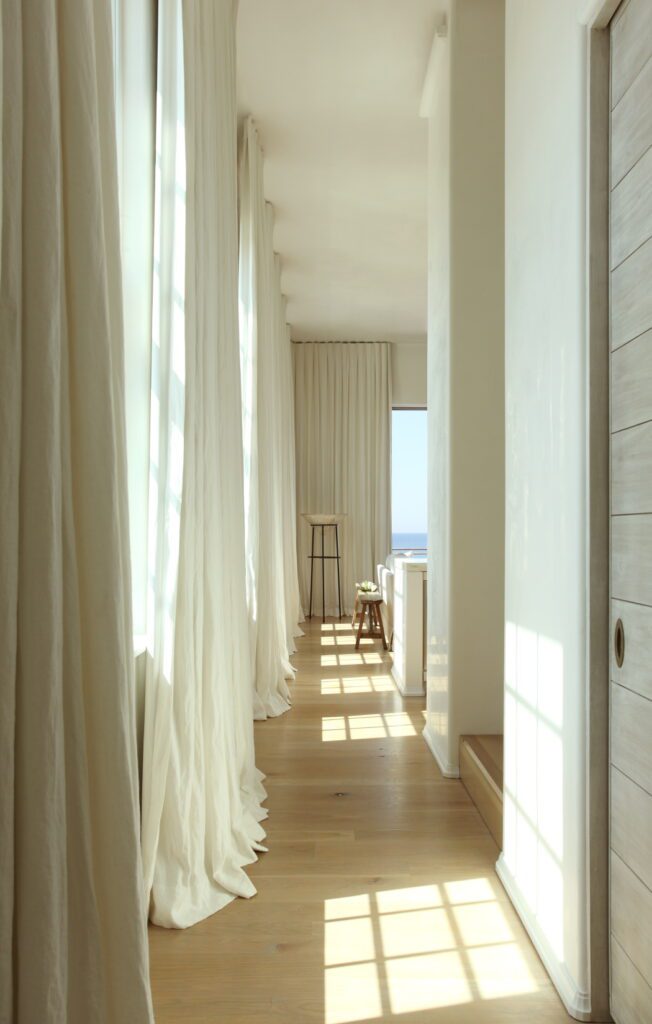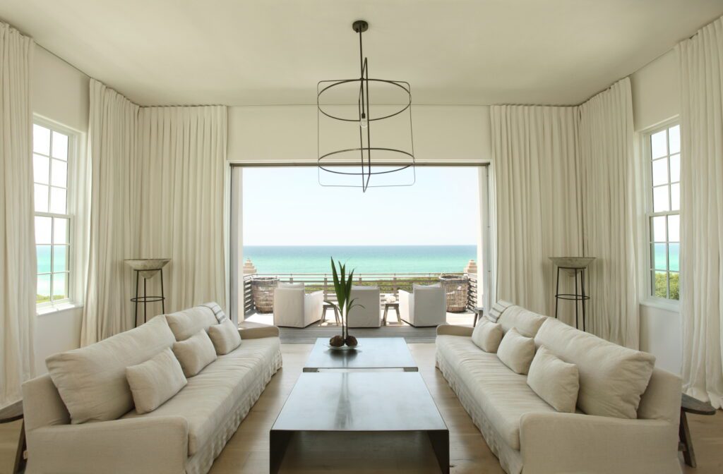 “Given the value and desirability of Gulfront lots, the footprint was smaller than other lots in Alys,” Marieanne says. “To compensate for this, the design code allowed for three floors of living space, which immediately resulted in a kind of townhouse configuration, with a main living room raised to the second floor for the best views.” While the town of Alys Beach is inspired by Bermudan architectural influences, the Gulf-side lots drew from Mediterranean precedents for this courtyard house tailored to the site’s zero lot line constraints. “We wanted an architectural form that could be sculptural without being