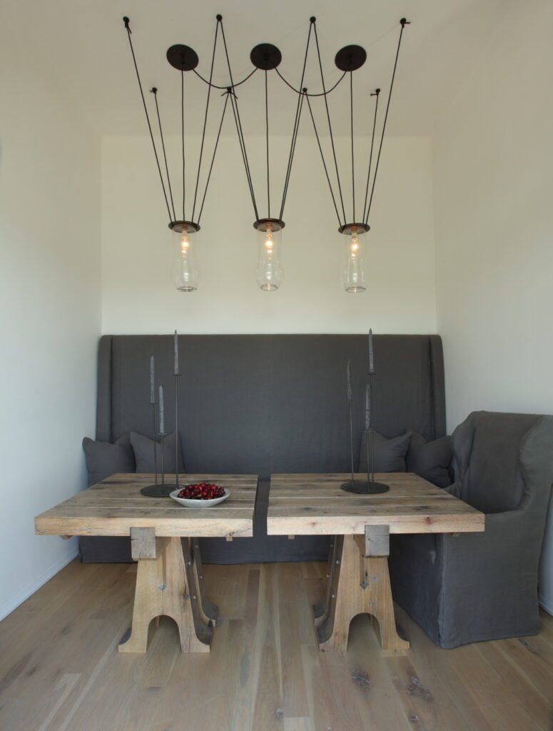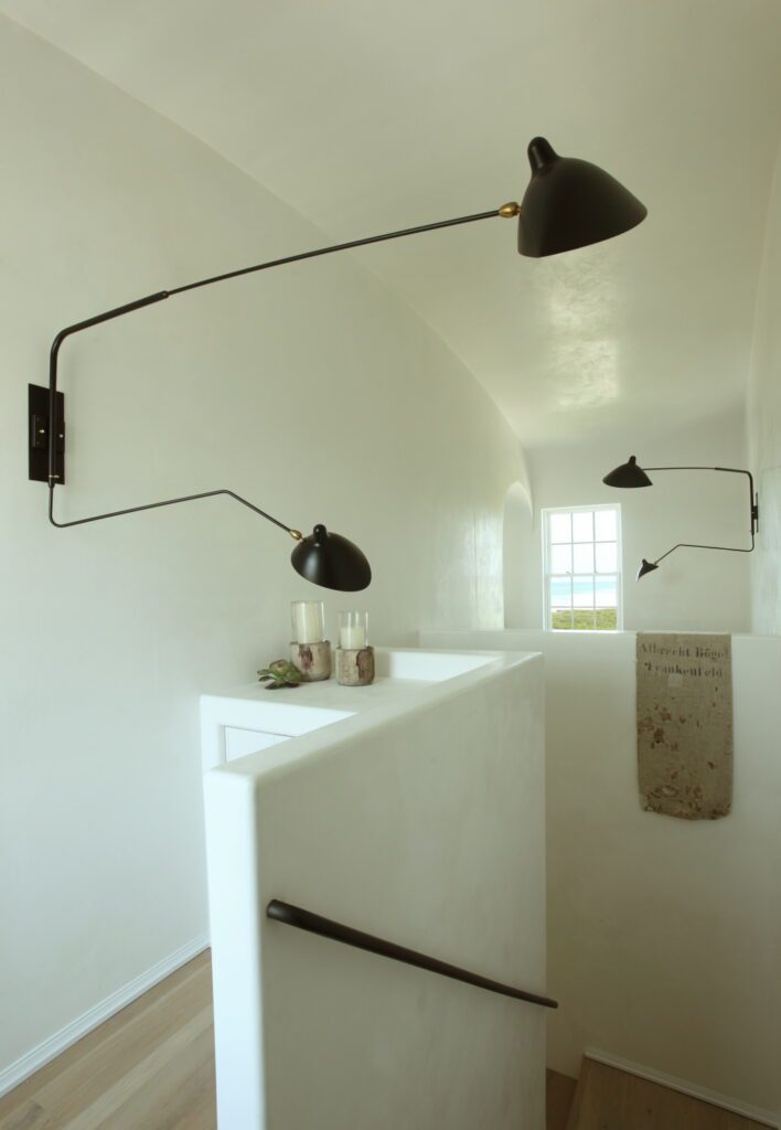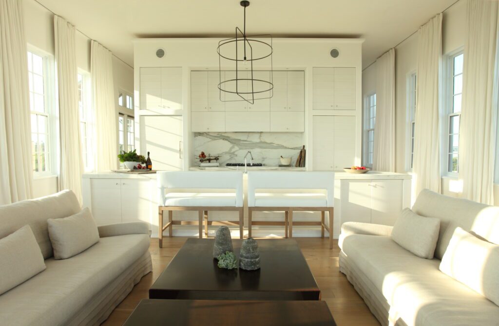 On all three floors, the design emphasizes “long axes and perspectival views,” Marieanne says. “The lot size is modest, so we always want to draw your eye out and extend your views as much as possible. We tried to be judicious and deliberate in designing the floor plan.” As one ascends the first stair, one enters into a family room that spans the second floor, and one’s gaze naturally travels to a bowed bay window. The livjng room at the front of the house opens up with a floating kitchen wall and a dining alcove positioned toward land; on the Gulf side, opened pocket doors dial up the expansive views, accompanied by a loggia balcony projecting over the courtyard.