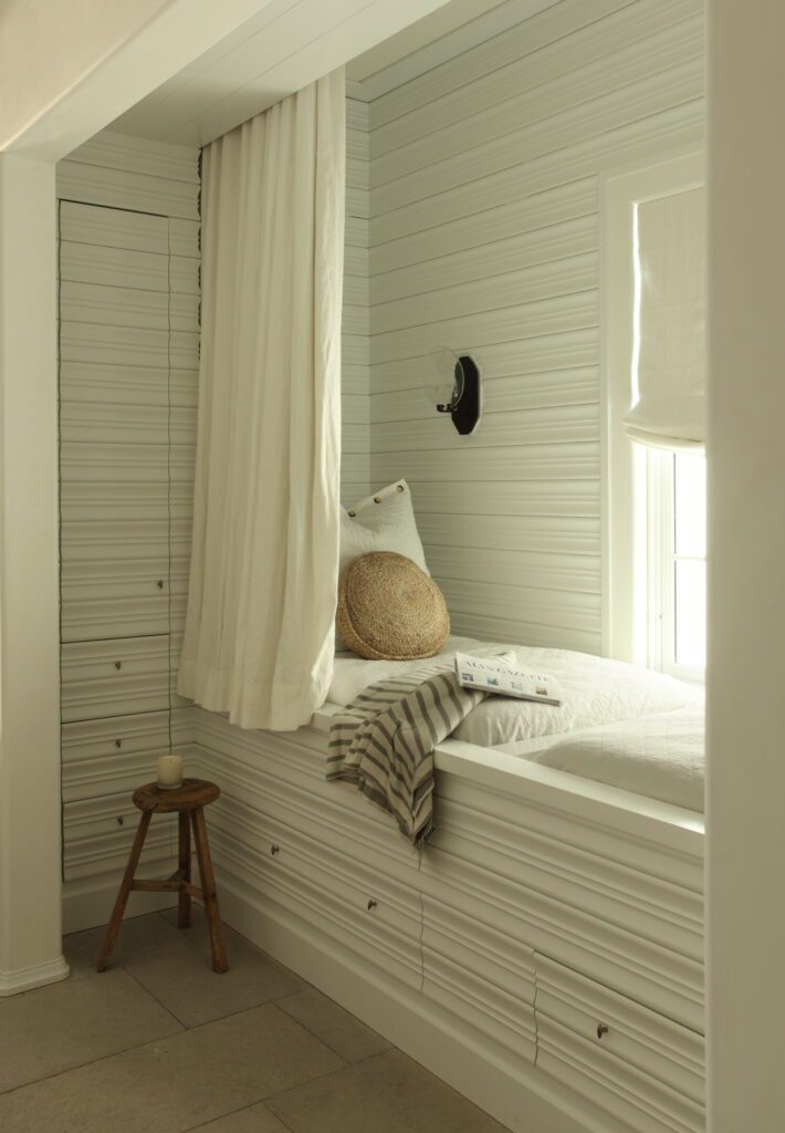 The uppermost floor echoes the second floor. Stairs divide the floor plate into landward and seaward sections, the master bedroom opens up to a porch with pocket doors, and the master bath floats in a vaulted space as “a room within a room with buttressed comers, ilkea miniaturized version of tl1e house itself,” Marieanne says. On tl1e northern side, an additional bedroom suite has a balcony above the family room bay below. While affording ample privacy, tl1e tl1ird floor also offers a striking twist on the maritime ambiance. “When you’re in the master bedroom, it is akin to being on a ship as the expansive ocean is the principal view and a most desirable space to watch the sun rise and set,” Marieanne says.