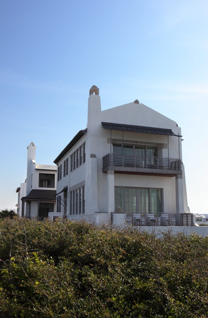 panhandle to help get this New Urbanist community up and running, they did not realize they would spend the next 20 years as town architects here. The first Gulf-front residence in Alys Beach shows how thoughtful design and meticulous execution can create a timeless masterpiece on the coast. The Gulf-side home design borrowed from Mediterranean precedents including a courtyard, loggias, balconies, parapets, copper awnings, limestone flourishes, and acroteria ornamentation.