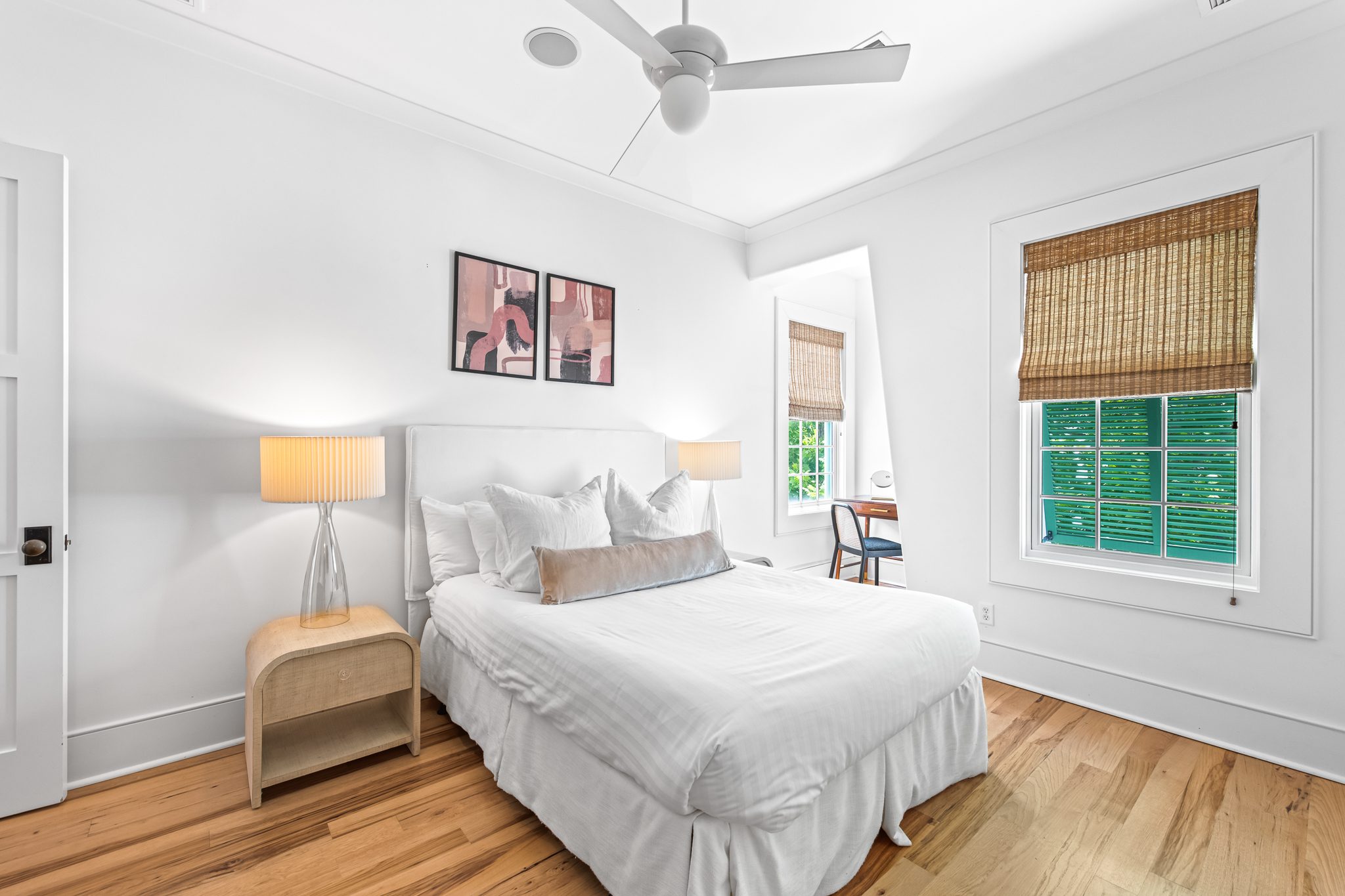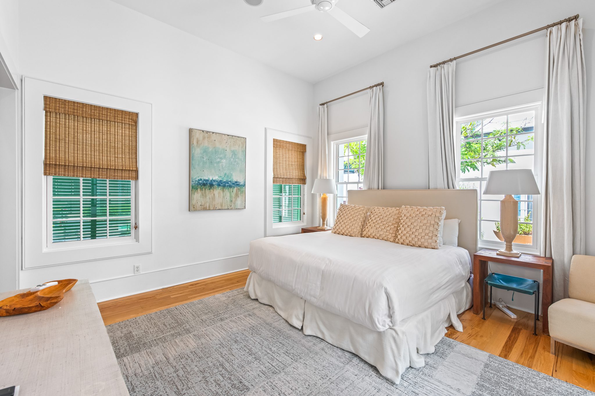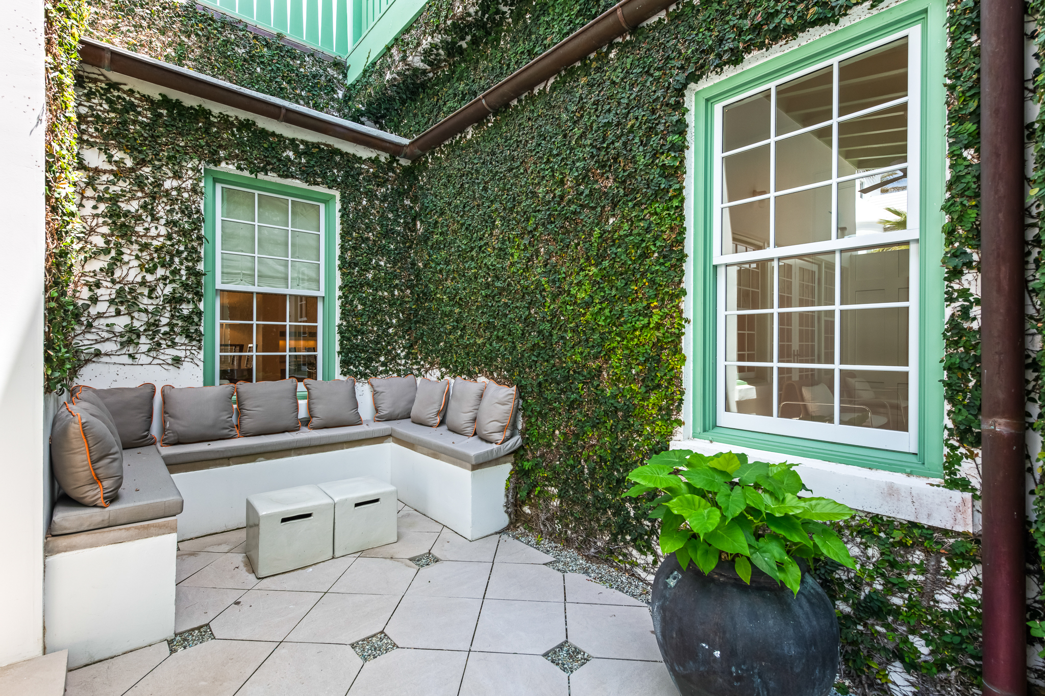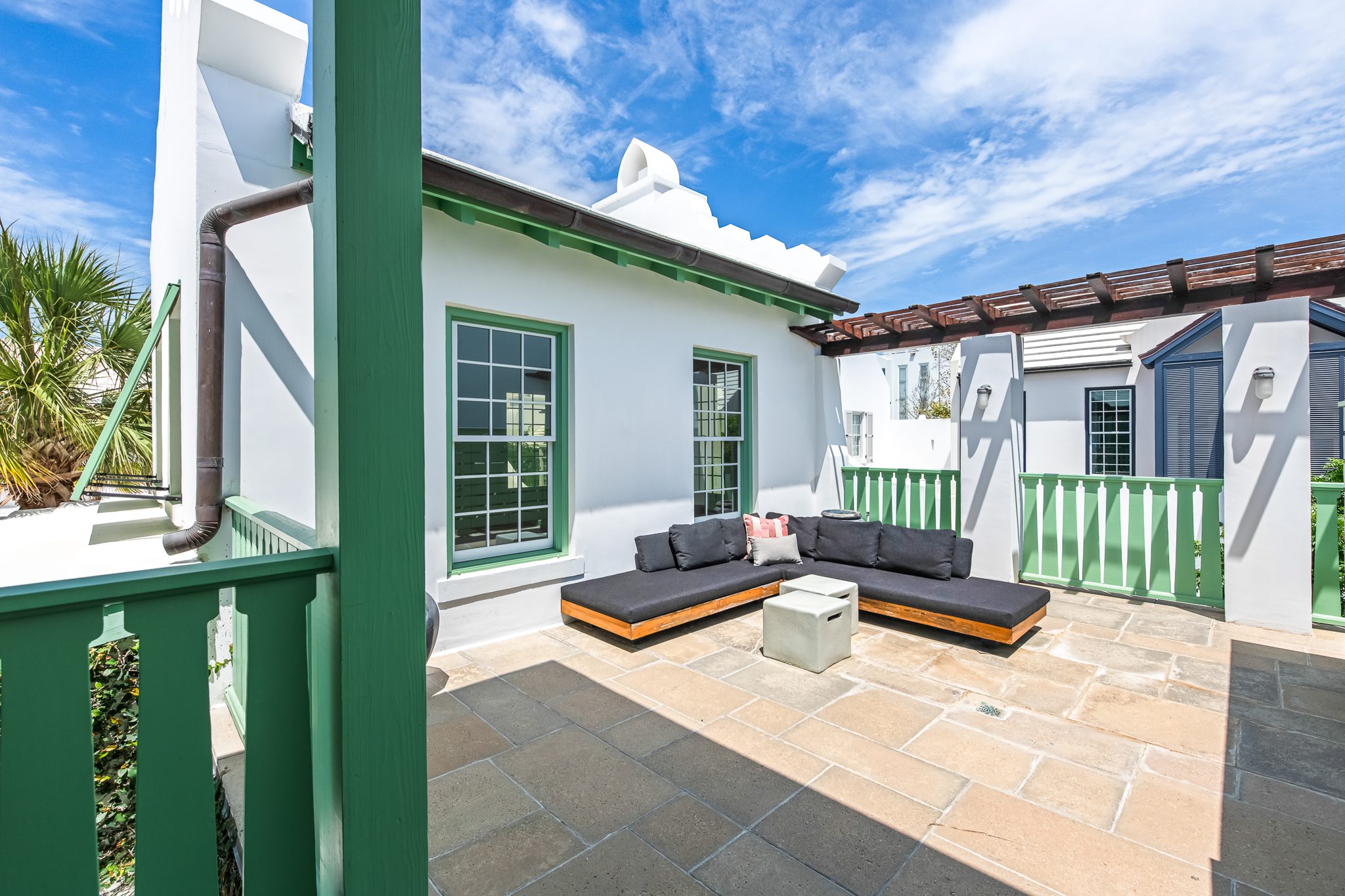 Upstairs, two guest suites connect through a louvered gallery and open onto a spacious rooftop terrace overlooking the landscaped pedestrian pathway.