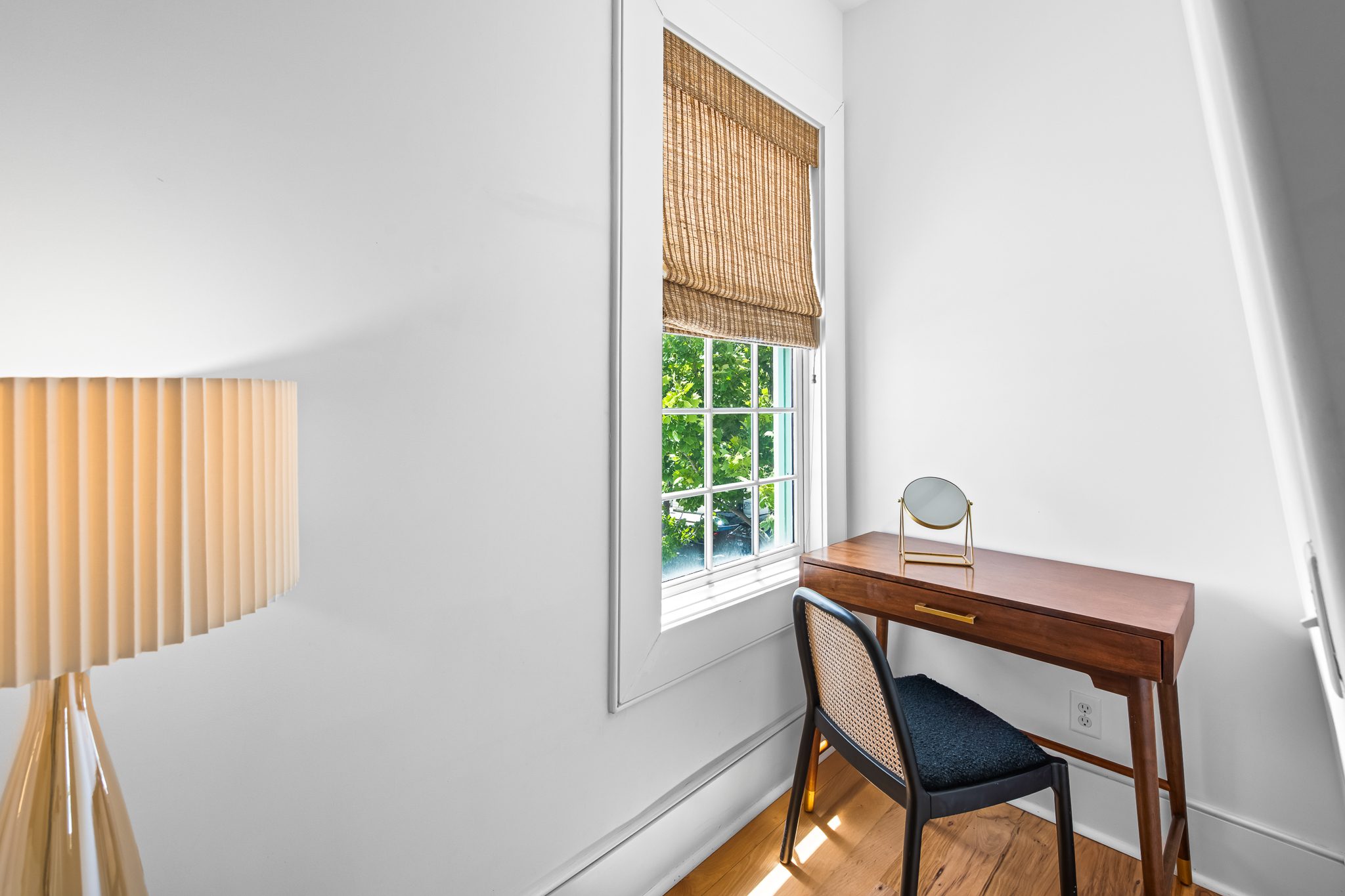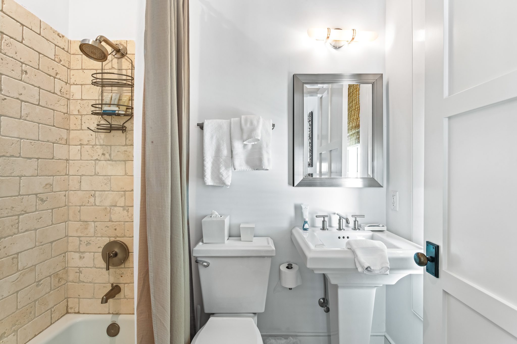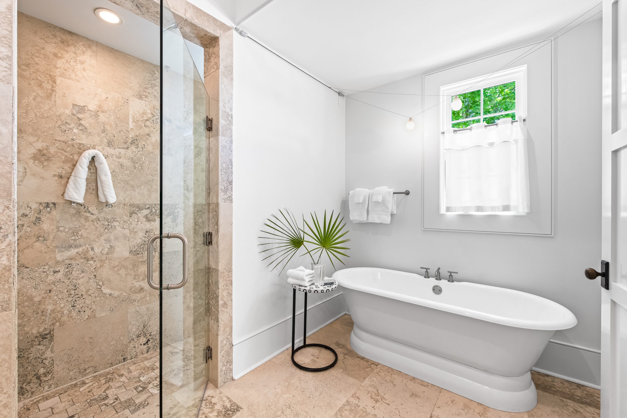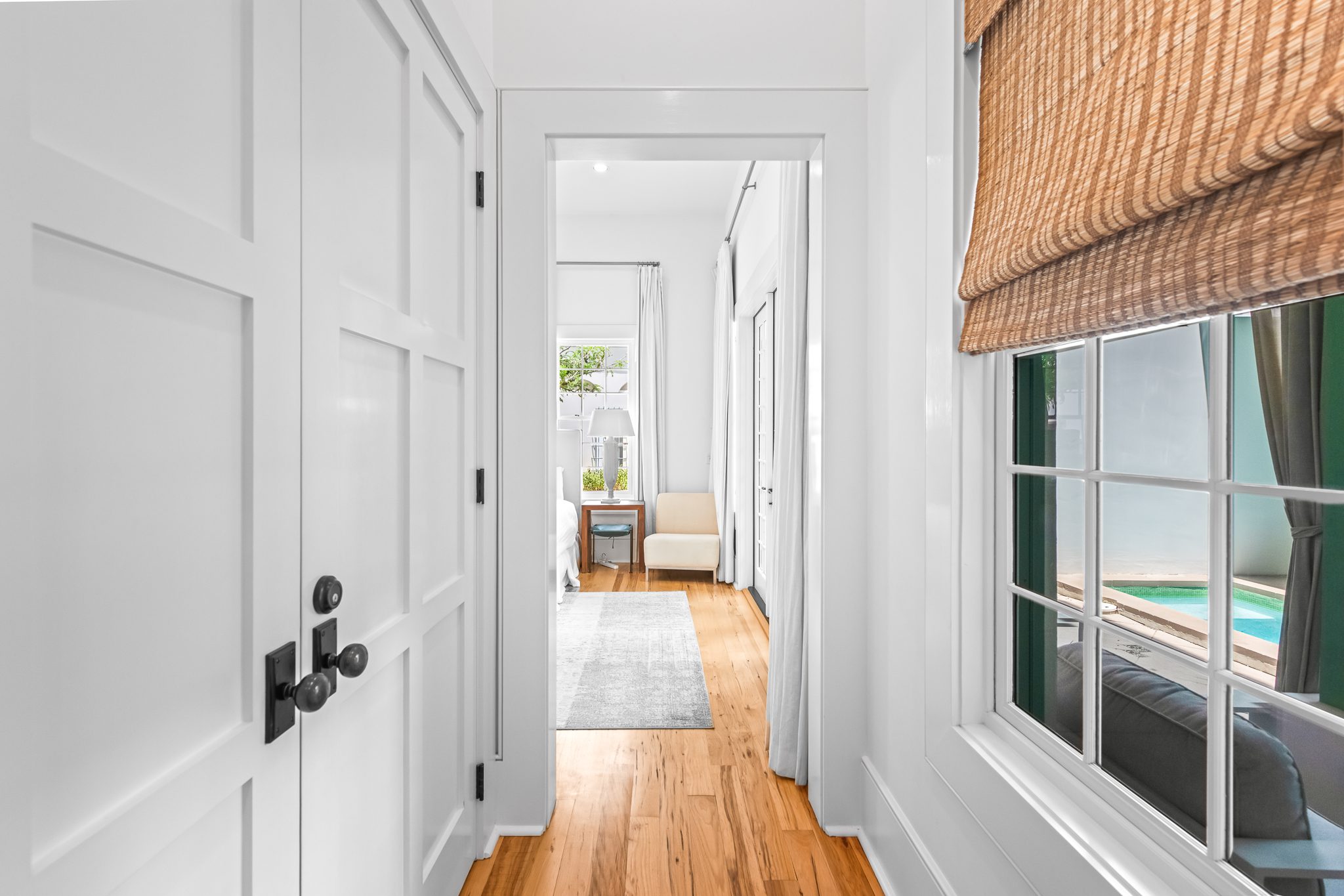 Upstairs, two guest suites connect through a louvered gallery and open onto a spacious rooftop terrace overlooking the landscaped pedestrian pathway.