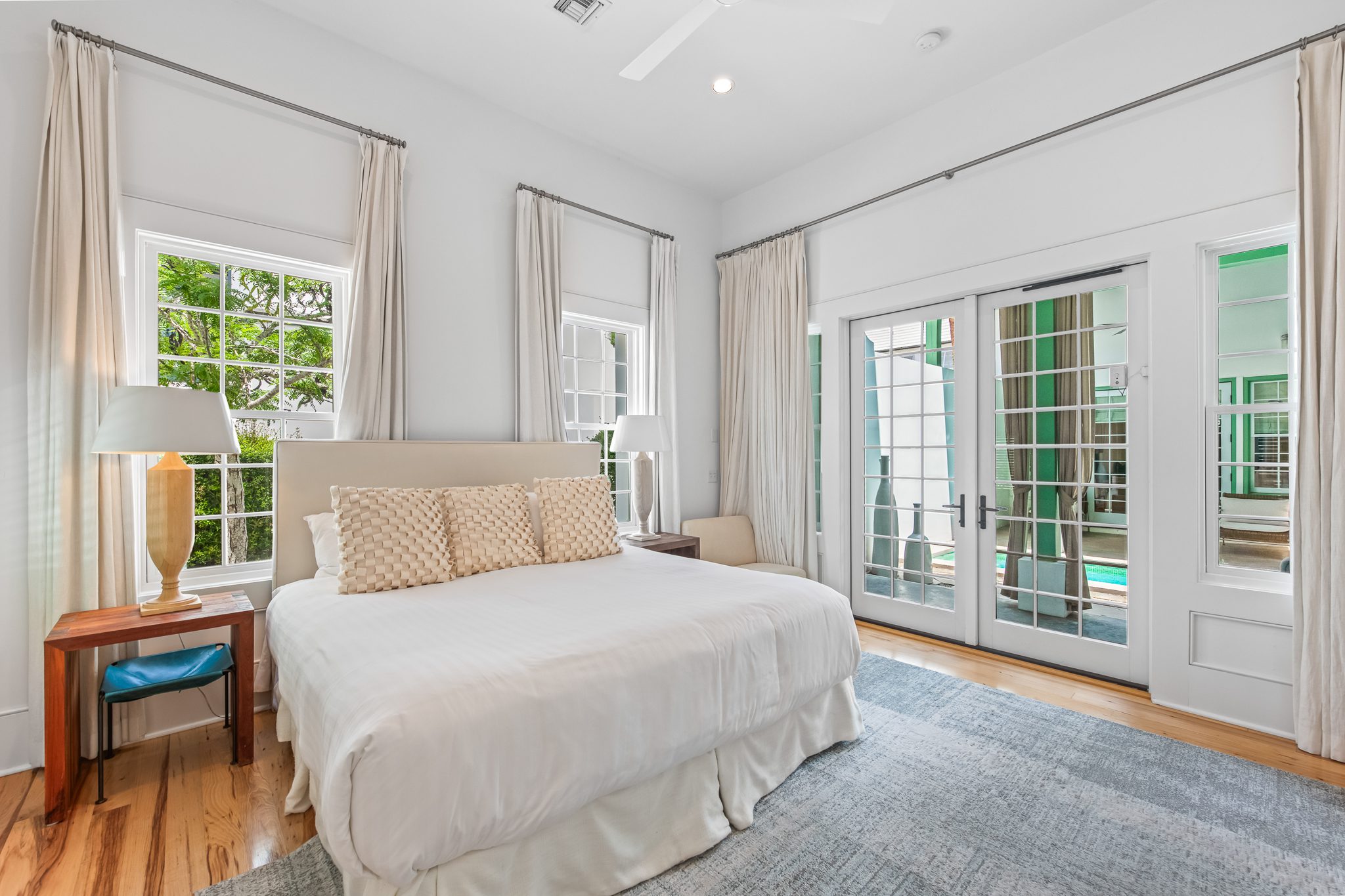 A fireplace nook anchors the main living area. French doors from both the living room and first-floor primary suite open directly to the private courtyard. Designed for year-round use, the courtyard includes a dipping pool, built-in seating, and an outdoor fireplace surrounded by mature greenery.