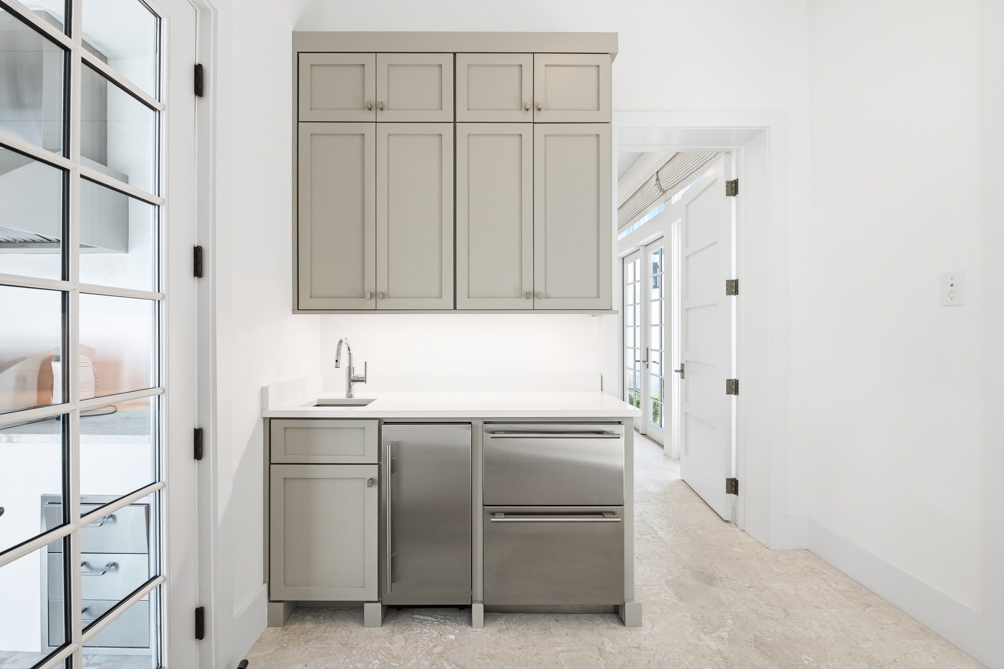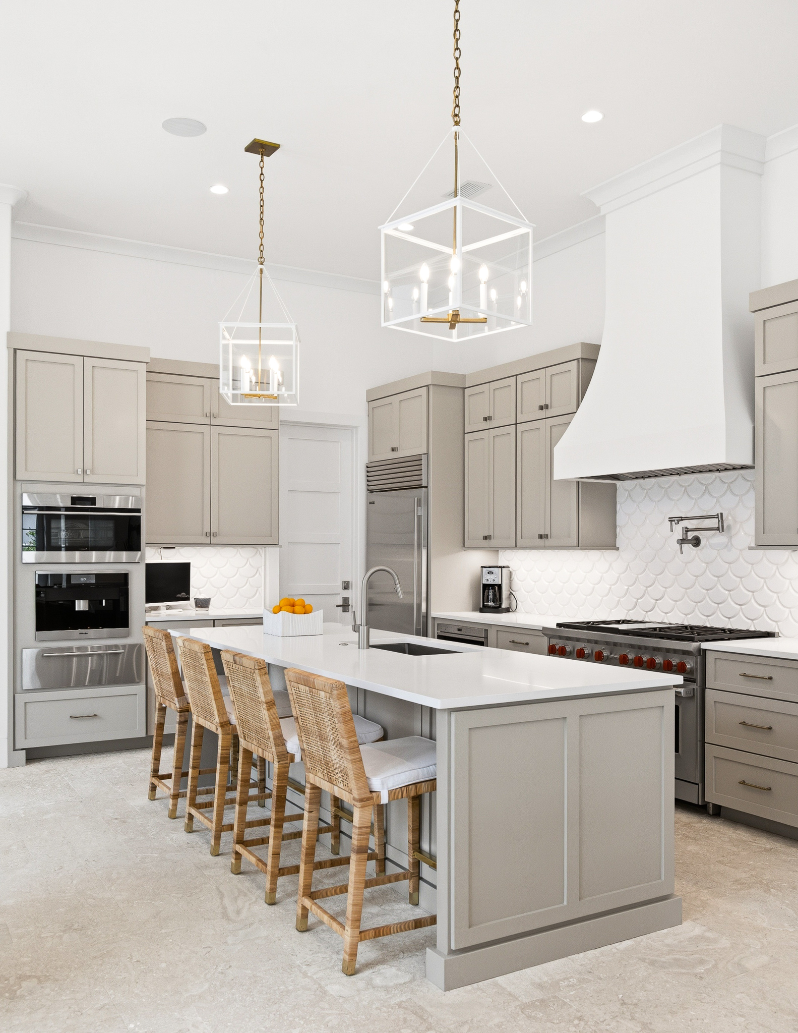 Designed around a stylish outdoor courtyard, the property boasts a generous swimming pool and a covered loggia, perfect for relaxation and family gatherings. The great room captivates with soaring double-height ceilings and an inviting gas fireplace, exuding warmth and elegance. The gourmet kitchen is a chef’s dream, equipped with a 48-inch Wolf range, a spacious pantry, and seamless access to a large dining room that overlooks a serene courtyard adorned with a tranquil garden, soothing fountain, and outdoor summer kitchen.