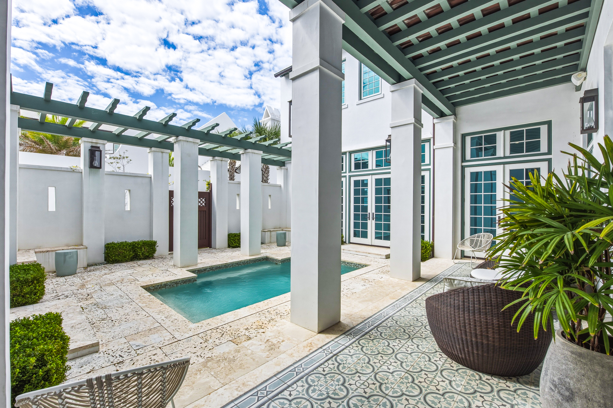 Thoughtfully crafted with Dominican Shellstone flooring on the first level and stunning stained oak on the second, each bedroom features en suite bathrooms with exquisite tile work and stone countertops, complemented by spacious closets. This home is not just a residence; it’s an entertainer’s paradise gifting the outdoor courtyard and swimming pool to your guests.