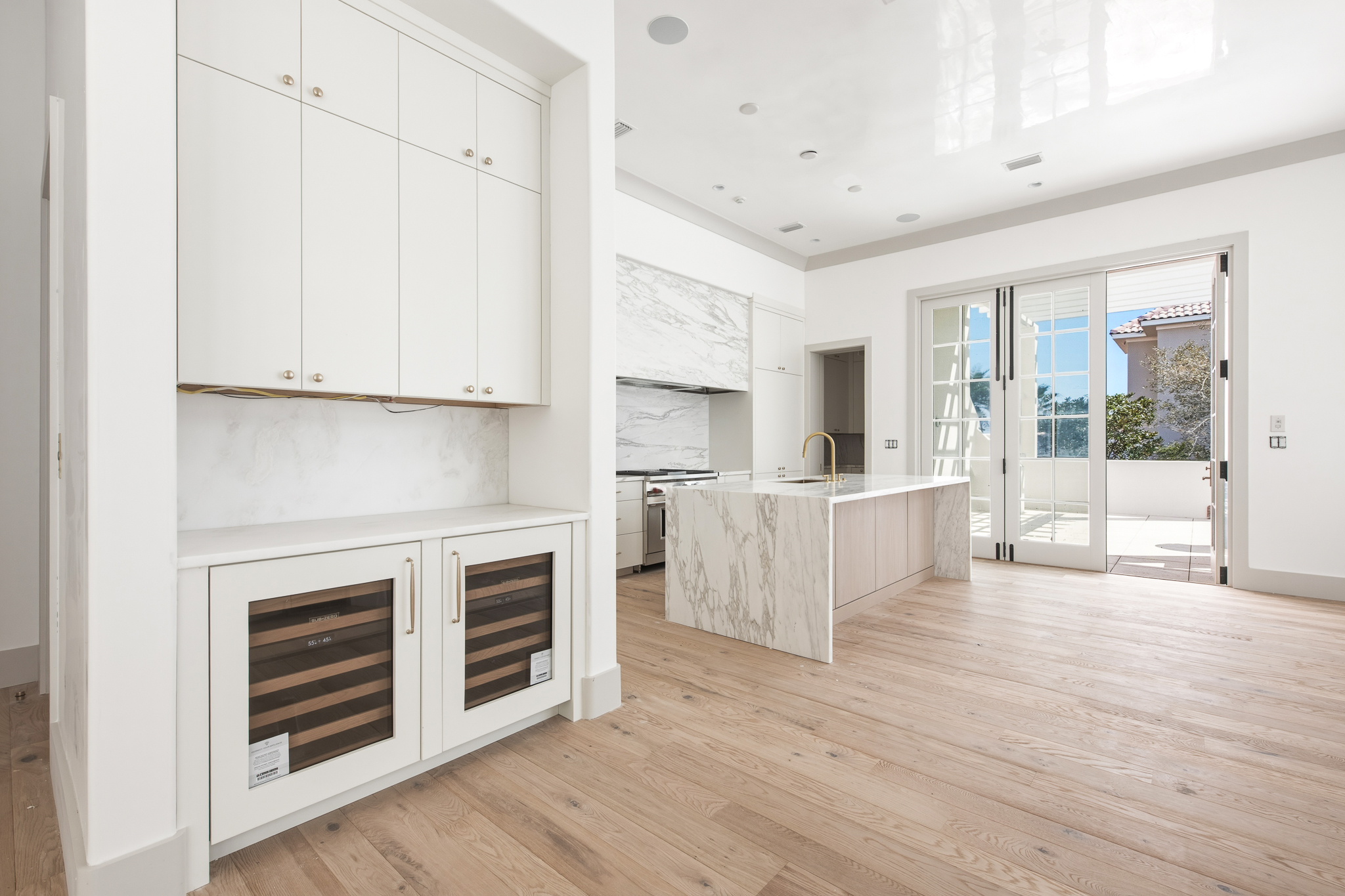 The main living area is an entertainer’s dream, showcasing a gourmet kitchen, dining room, and living room, all anchored by a cozy fireplace and a fully equipped wet bar plus Butler’s pantry. Large-scale windows and sliding doors bathe the space in natural light, creating an inviting atmosphere. This level also features one of three captivating terraces, seamlessly integrating indoor and outdoor living with a dining area under the stars and a summer kitchen, perfect for al fresco dining.