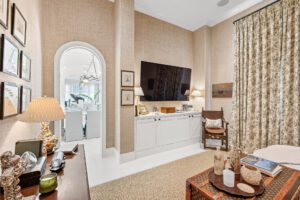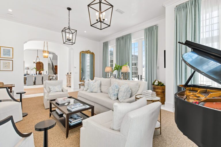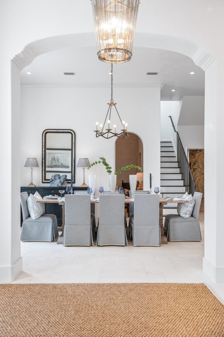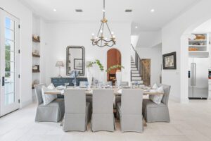 Step inside to the grand foyer, adorned with architectural ceilings that set the tone for the rest of the home. To the right, you’ll find a spacious living room, and to the left, an elegant dining room, both furnished with professionally designed decor and custom window treatments.