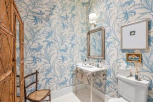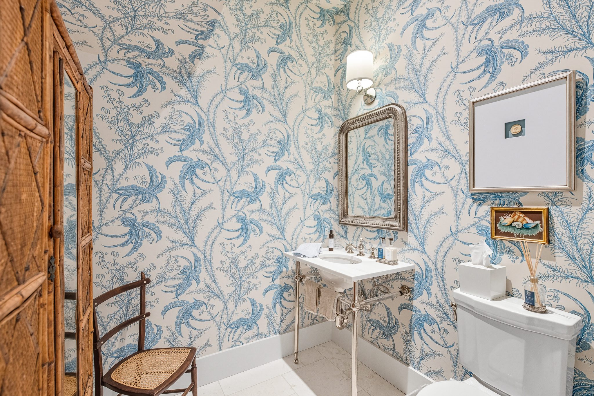 The 1st floor primary suite is designed for ultimate comfort, overlooking the home’s tranquil courtyard and swimming pool. This oasis boasts his and her closets, as well as separate water closets. The spa-like bathroom features luxurious marble and exquisite tilework, a bubbling tub, and a spacious steam shower.